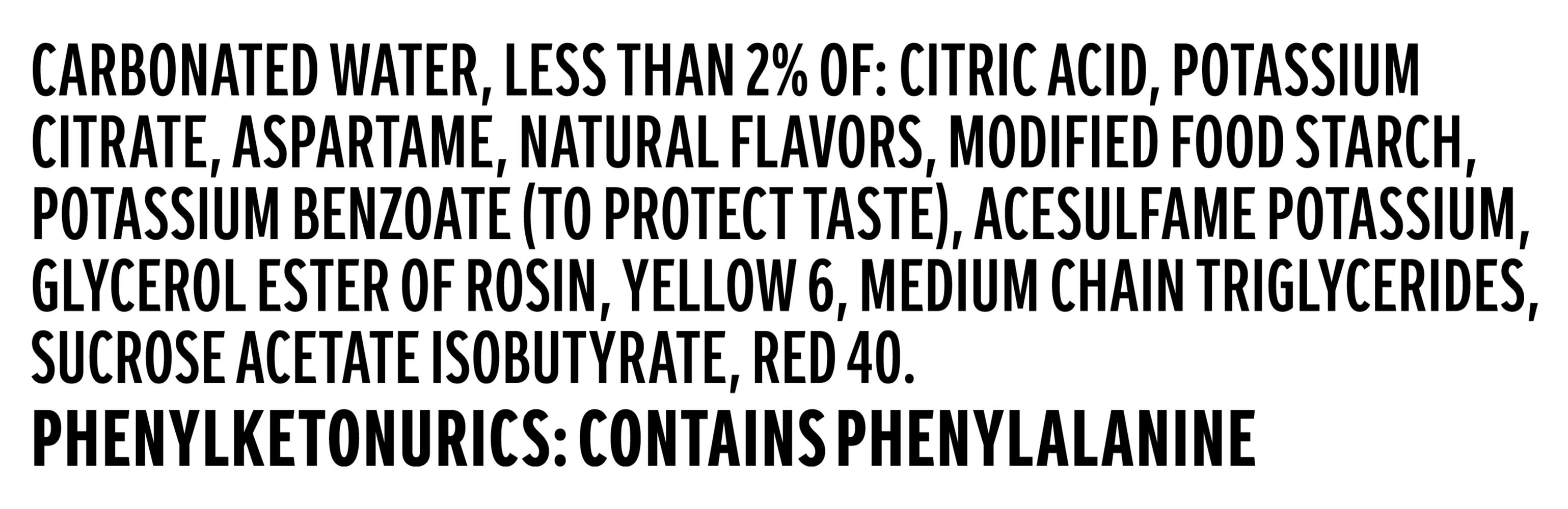 Ingredients: Carbonated Water, Citric Acid, Potassium Citrate, Aspartame, Natural Flavors, Modified Food Starch, Potassium Benzoate (To Protect Taste), Acesulfame Potassium, Glycerol Ester Of Rosin, Yellow 6, Medium Chain Triglycerides, Sucrose Acetate Isobutyrate, Red 40.