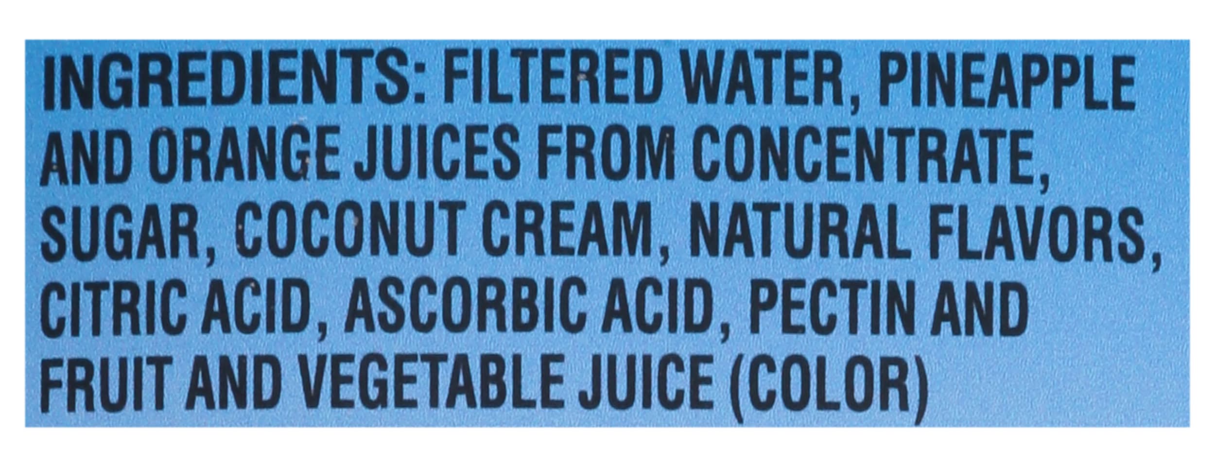 Ingredients: Filtered Water, Pineapple and Orange Juices from Concentrate, Sugar, Coconut Cream, Natural Flavors, Citric Acid, Ascorbic Acid, Pectin and Fruit and Vegetable Juice (Color) Contains: Tree Nuts, Coconuts