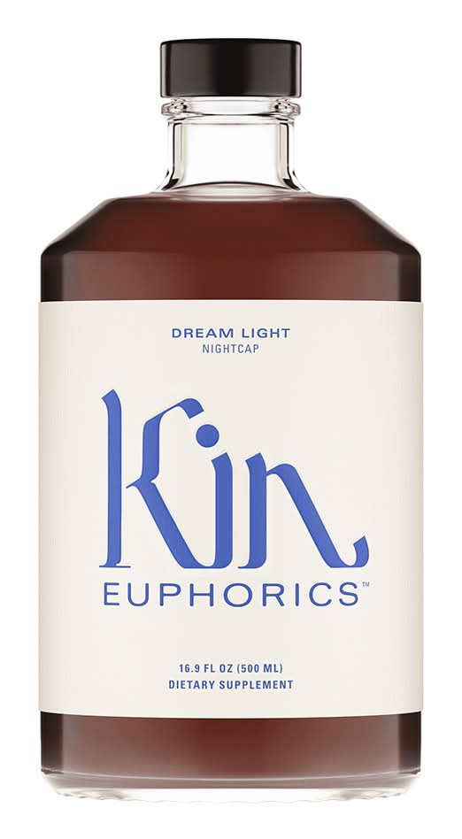Kin Euphorics Nightcap Dream Light is a non-alcoholic beverage presented in a 750ml bottle. It features a blend of spices that include smooth, earthy oak tones alongside smoky clove and spicy cinnamon, creating a distinct and inviting flavor profile.