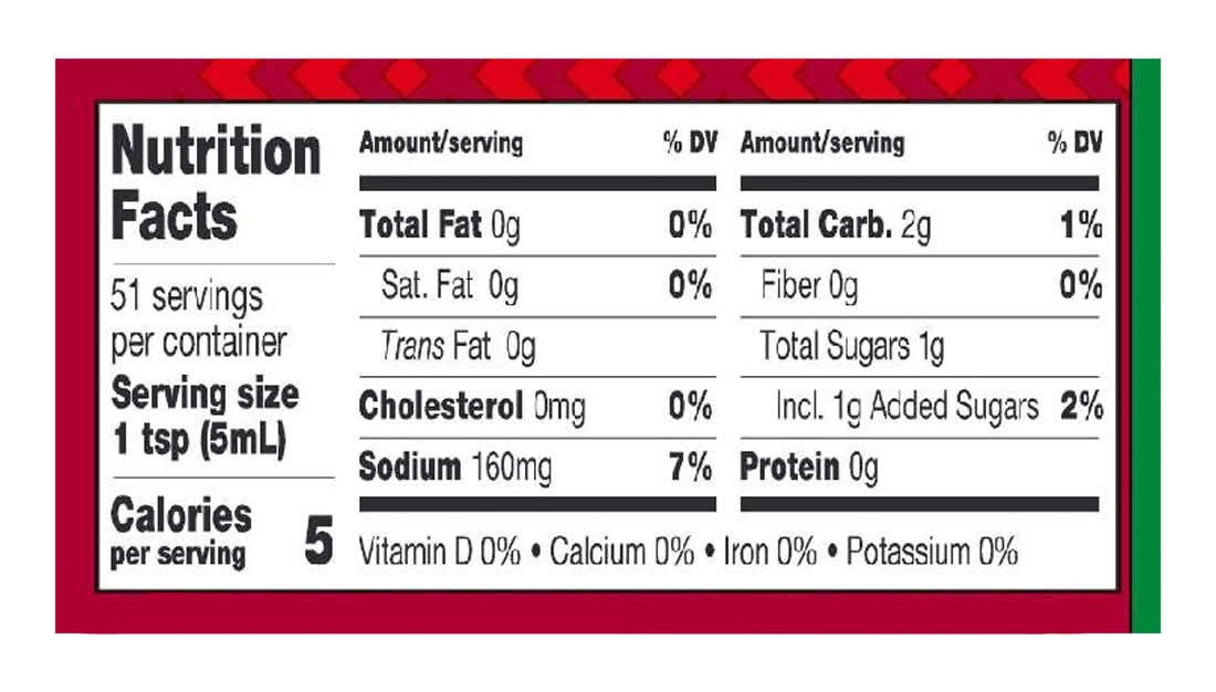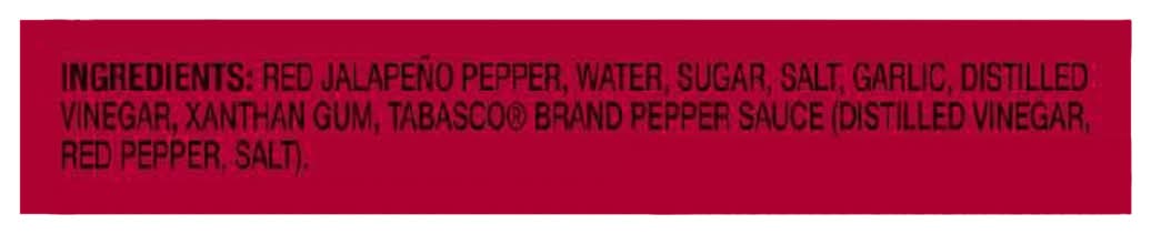 Ingredients: Red Jalapeno Pepper, Water, Sugar, Salt, Garlic, Distilled Vinegar, Xanthan Gum, Tabasco Brand Pepper Sauce (Distilled Vinegar, Red Pepper, Salt)
