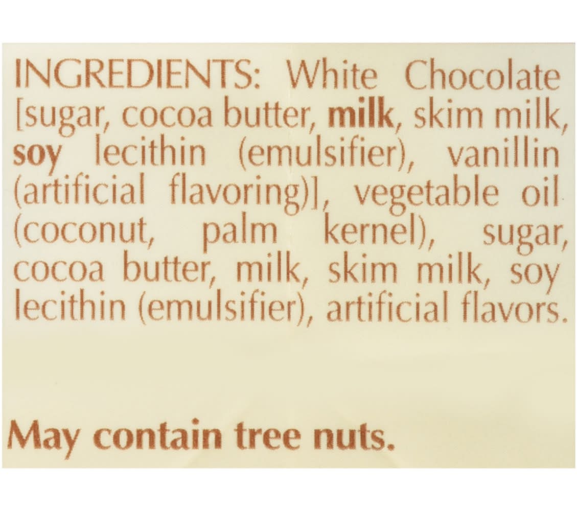 Ingredients: vanillin (artificial flavoring)], Artificial Flavors, Skim Milk, Soy Lecithin (Emulsifier), Cocoa Butter, Sugar, Vegetable Oil (Coconut, Palm Kernel), White Chocolate Contains: Milk, Soybeans, Tree Nuts