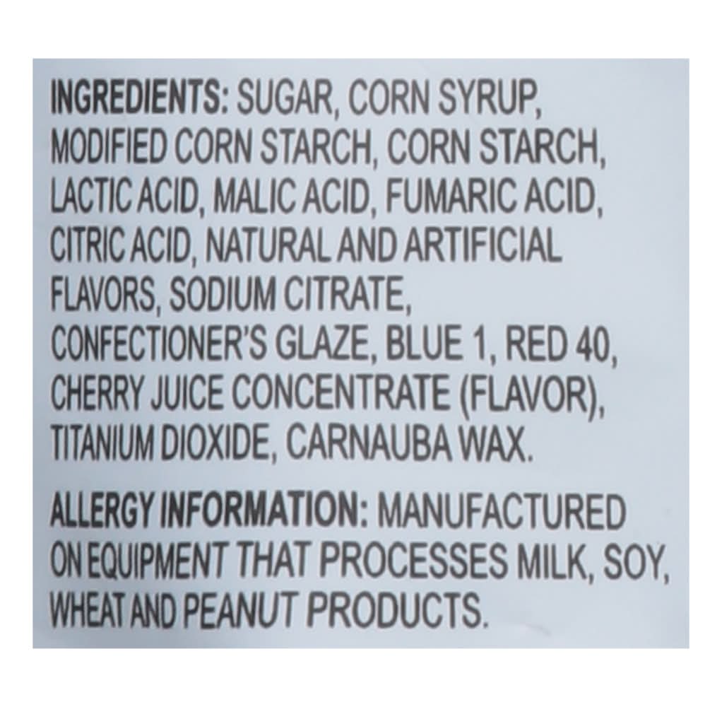 Ingredients: Sugar, Corn Syrup Modified Corn Starch, Corn Starch, Lactic Acid, Malic Acid, Fumaric Acid, Citric Acid, Natural and Artificial Flavors, Sodium Citrate, Confectioner's Glaze, Blue 1, Red 40, Cherry Juice Concentrate (Flavor), Titanium Dioxide, Carnauba Wax Contains: Corn, Milk, Soybeans, Wheat, Peanuts