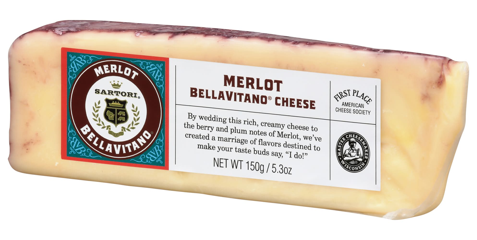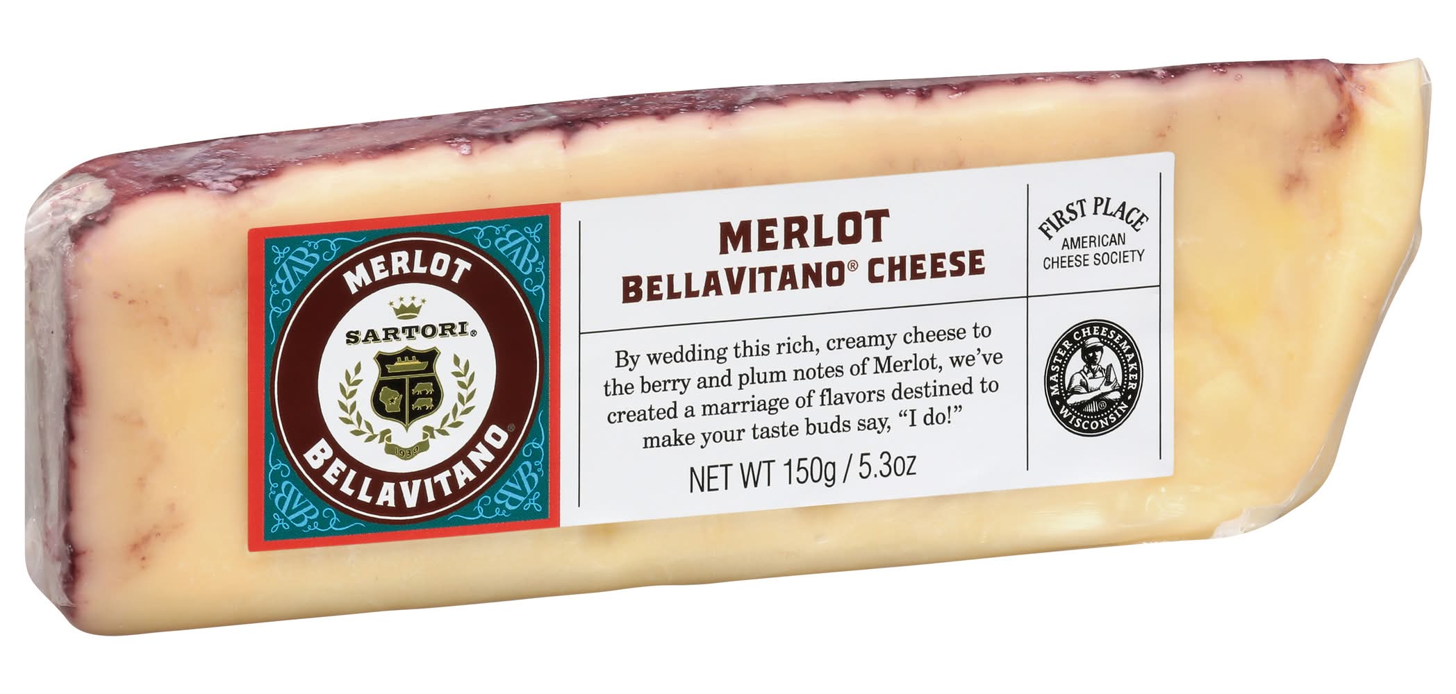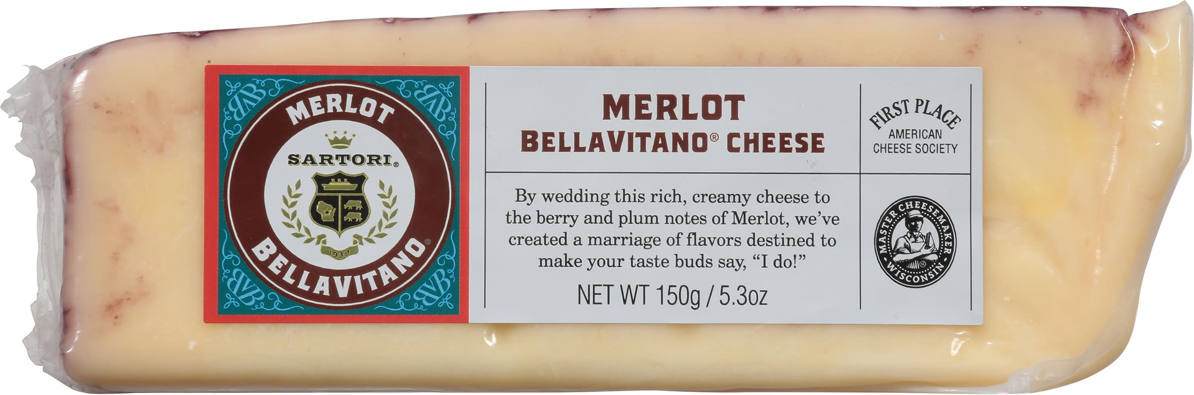 We take our BellaVitano Gold and immerse it in a fine Merlot wine. Additional aging allows the parmesan-like flavors to subtly marry with the merlot bringing out very subtle hints of fruits. Dark in color, the wine enhances but does not overwhelm the cheese. Sartori Co., Plymouth, WI, 53073