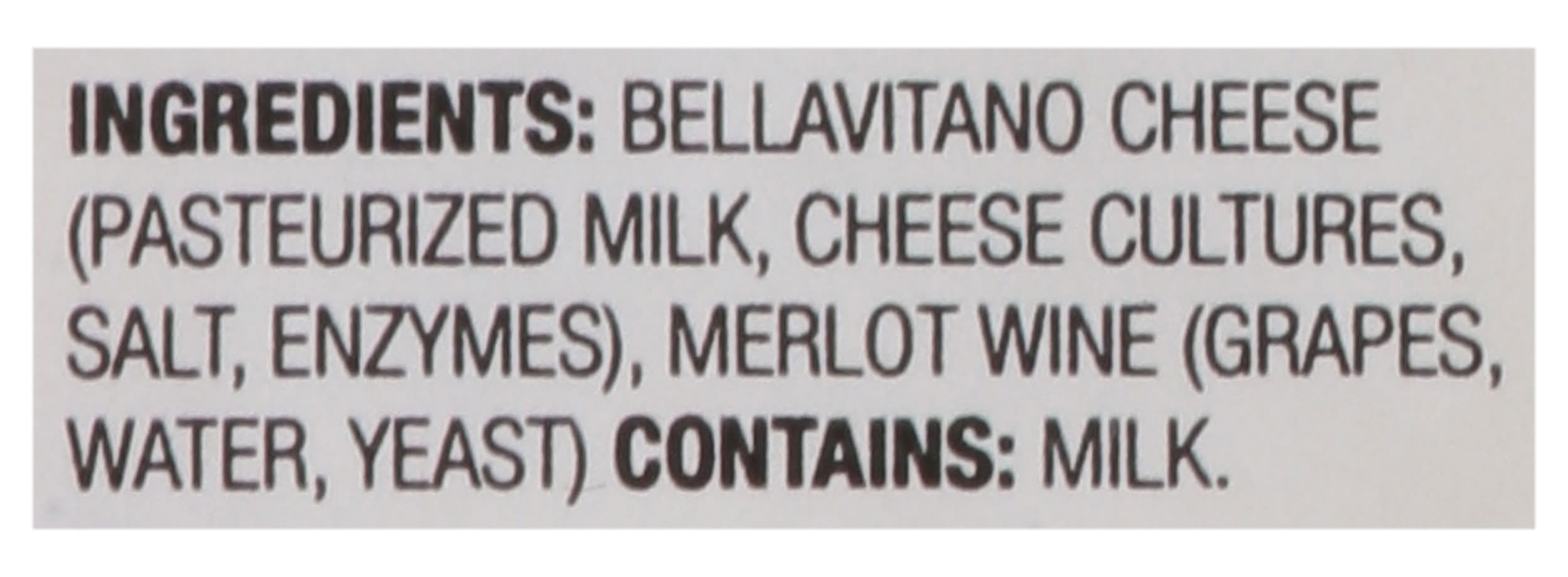 Ingredients: Bellavitano Cheese (Pasteurized Milk, Cheese Cultures, Salt, Enzymes), Merlot Wine (Grapes, Water, Yeast) Contains: Milk