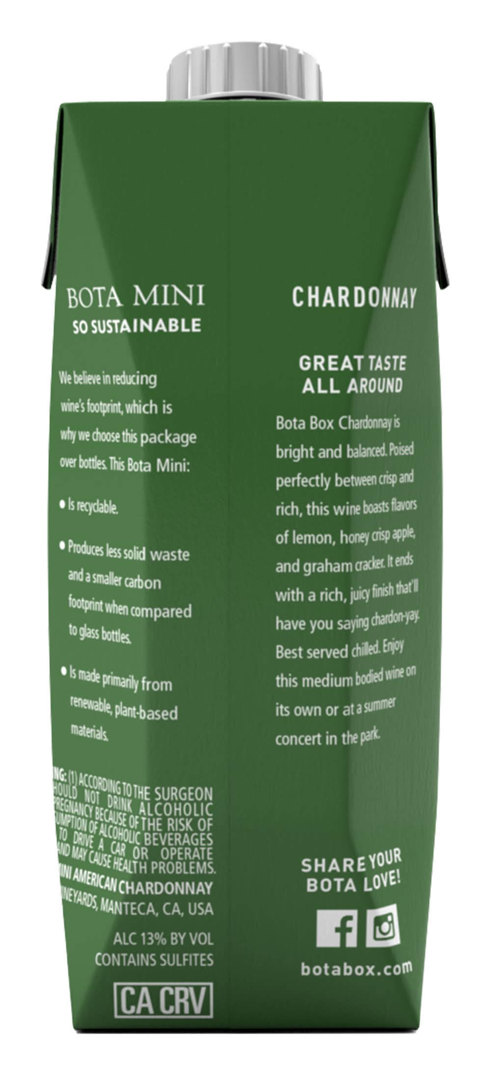 Great wine doesn't need to cost the earth. Taste the Adventure: Chardonnay is the No. 1 varietal for a reason. Bota's creamy Chardonnay is characterized by aromatics of toasty oak and tropical fruit, yielding to a body of creme brulee, green apple, and honeysuckle. Join our adventures, and share yours. Best buys. Over 50 gold medals. A package from Tetra Pak. Tetra Pak: Projects what's good. Tetra Prisma Aseptic. The original environmentally-friendly box. This Bota Mini has a smaller carbon footprint than a bottle: 75% fewer greenhouse gas emissions. 50% less waste. Lower fuel emissions thanks to lighter shipping weight. Made primarily from paper, a renewable resource. • Alcohol by volume: 13% • Packaging: Reusable