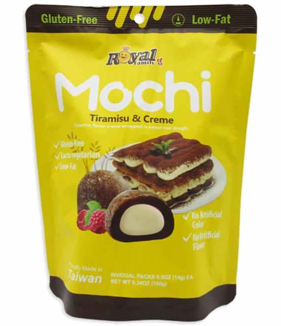 Royal Family Mochi has the soft texture of fresh mochi combined with a delightful filling, making a wonderful treat that pairs well with coffee or tea. Gluten free and low fat helps to make these a fresh, yummy, healthy and delicious sweet dessert. Each of them includes various amazing flavors. So enjoy these Tiramisu and Creme mochi today.