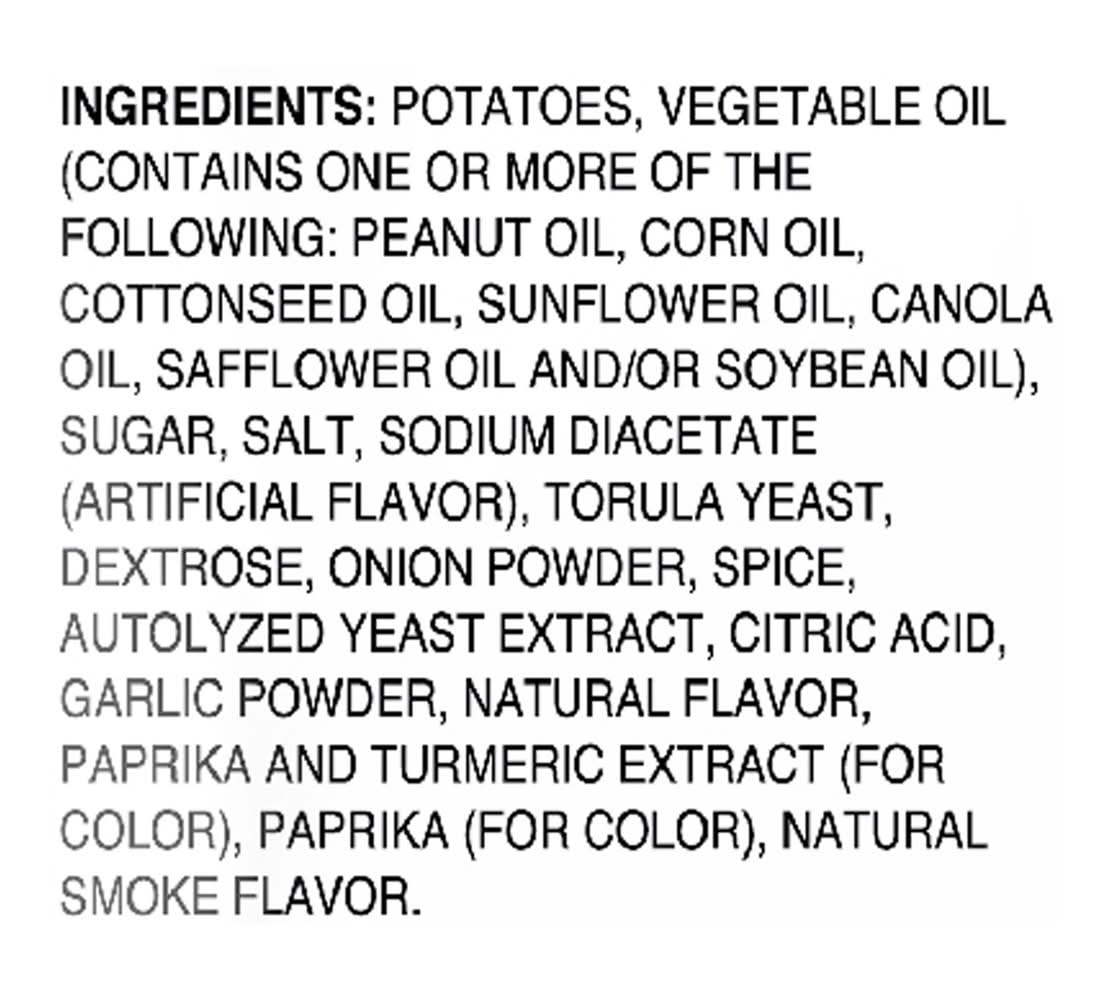 Ingredients: Potatoes, Vegetable Oil (Contains One or More of the Following: Peanut Oil, Corn Oil, Cottonseed Oil, Sunflower Oil, Canola Oil, Safflower Oil and/or Soybean Oil), Sugar, Salt, Sodium Diacetate (Artificial Flavor), Torula Yeast, Dextrose, Onion Powder, Spice, Autolyzed Yeast Extract, Citric Acid, Garlic Powder, Natural Flavor, Paprika and Turmeric Extract (for Color), Paprika (for Color), Natural Smoke Flavor Contains: Peanuts, Corn, Soybeans