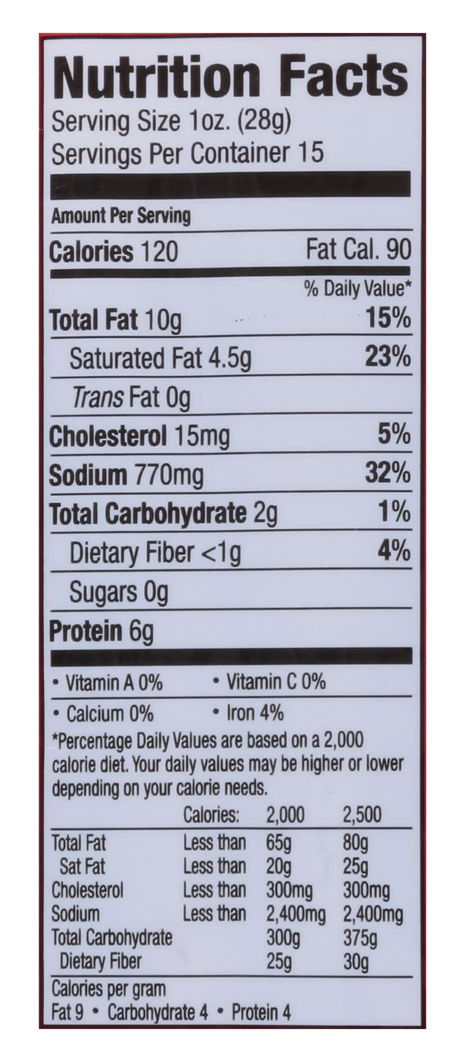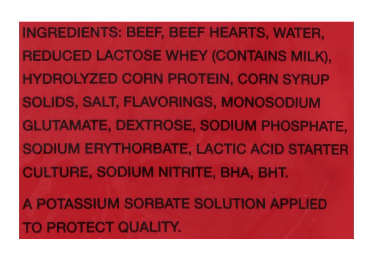 Ingredients: Beef, Beef Hearts, Water, Reduced Lactose Whey (Contains Milk), Hydrolyzed Corn Protein, Corn Syrup Solids, Salt, Flavorings, Monosodium Glutamate, Dextrose, Sodium Phosphate, Sodium Erythorbate, Lactic Acid Starter Culture, Sodium Nitrite, BHA, BHT Contains: Lactose, Milk, Corn