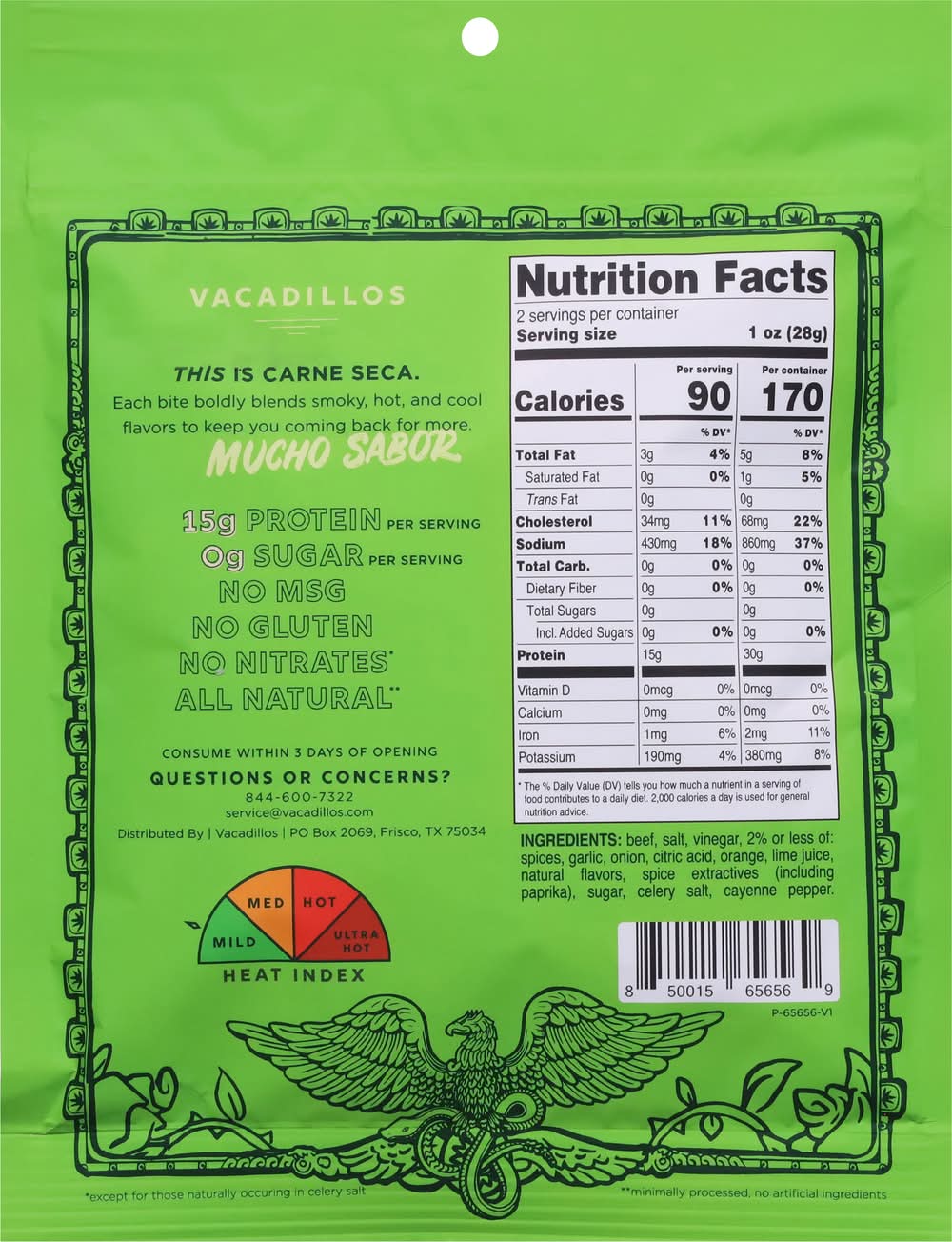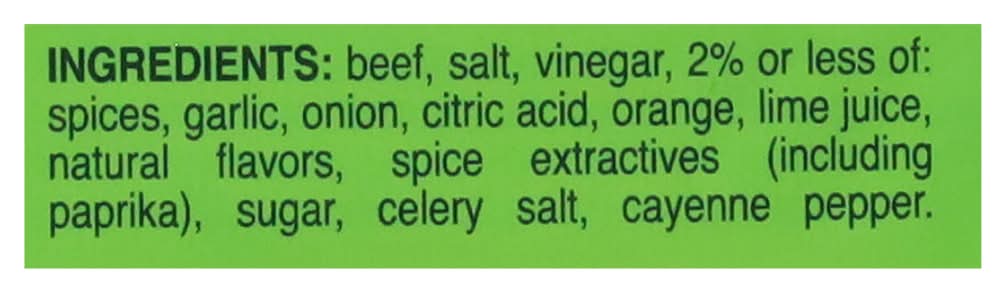 Ingredients: Beef, Salt, Vinegar, 2% or Less of: Spices, Garlic, Onion, Citric Acid, Orange, Lime Juice, Natural Flavors, Spice Extractives (Including Paprika), Sugar, Celery Salt, Cayenne Pepper Contains: Celery