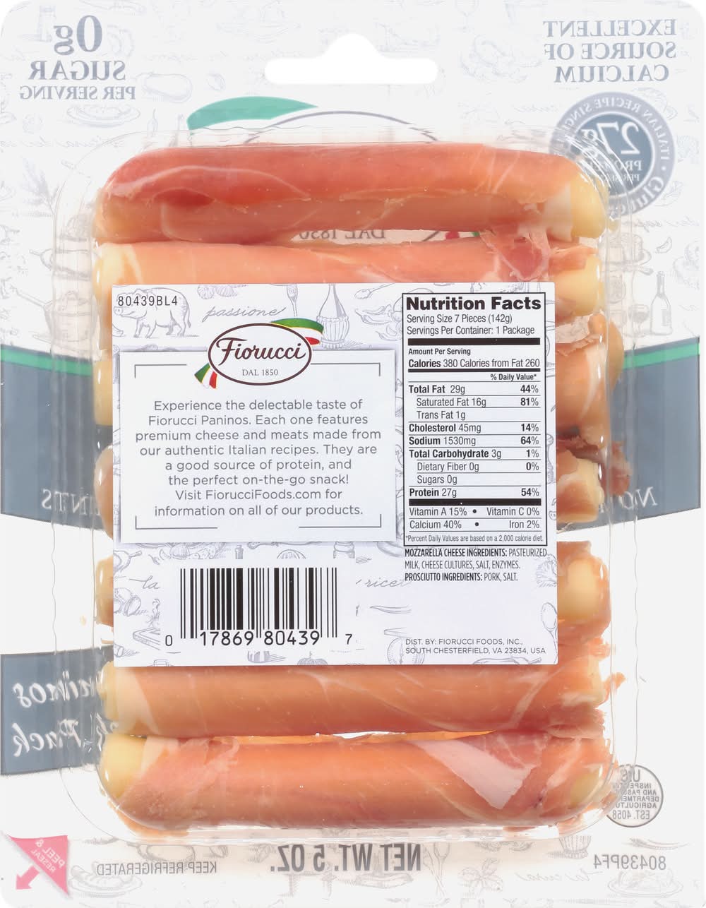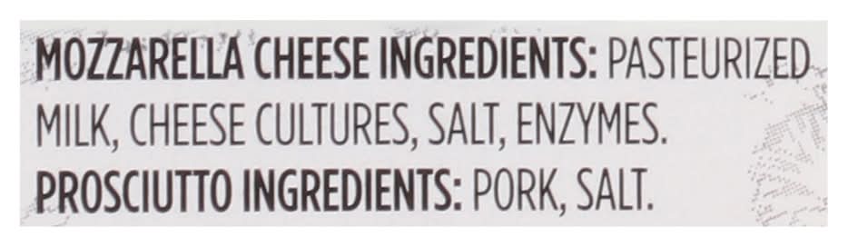 Ingredients: Mozzarella Cheese Ingredients: Pasteurized Milk, Cheese Cultures, Salt, Enzymes. Prosciutto Ingredients: Pork, Salt Contains: Milk