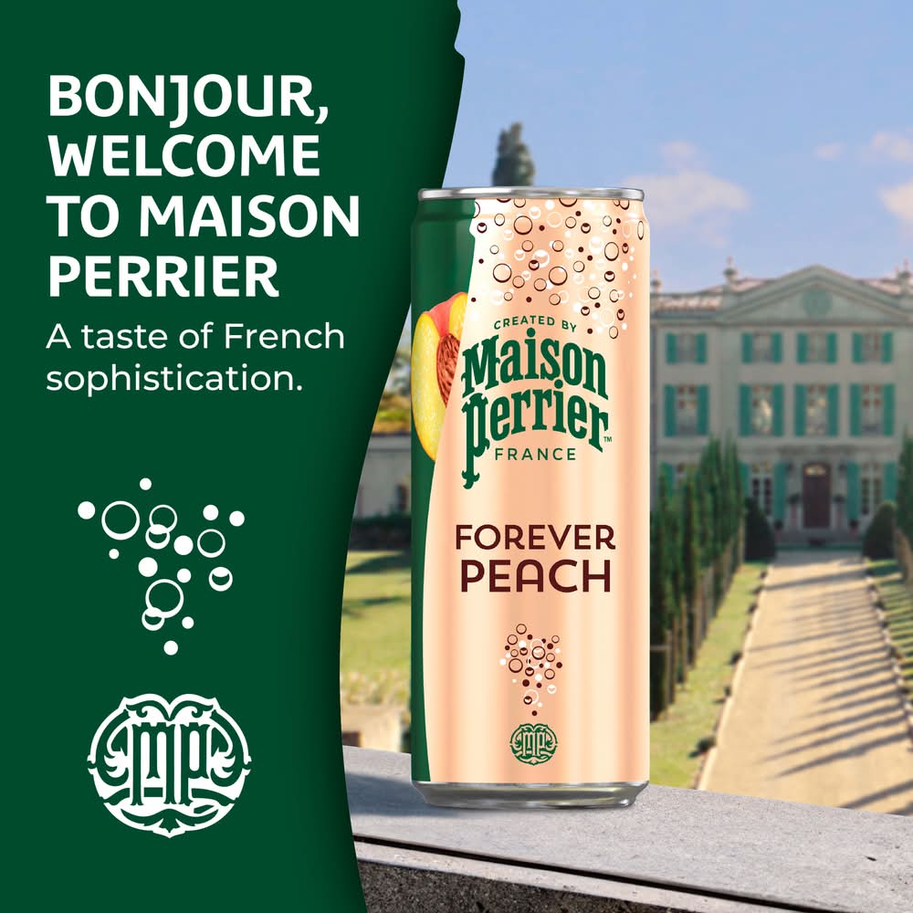 Indulge in a refreshing burst of flavor and bold bubbles with Maison Perrier Forever Peach Flavored Sparkling Water. A new premium sparkling water inspired by the iconic legacy of Perrier, Maison Perrier is an unsweetened sparkling water with natural flavors. French and sophisticated, Maison Perrier peach flavored sparkling water is bottled in Vergeze, France. This peach flavored sparkling water contains zero calories and sweeteners, making it a great alternative to sugary soda, tonic water, seltzer water, other carbonated water or club soda water. Maison Perrier sparkling water is a deluxe water that is the perfect ingredient for extraordinary mixed drinks or delicious non-alcoholic mocktails. Enjoy one at home or on the go. For peak refreshment, enjoy these cans of sparkling water slightly chilled. For more refreshment from the makers of Perrier water, try other delicious flavors, including Maison Perrier Lime Flavored and Maison Perrier Blackberry Flavored Sparkling Water. Delight your taste buds with this Maison Perrier Forever Peach Flavored Sparkling Water. Forever irresistible. Forever flavorful. Forever Peach. • Flavor: Peach • Pack size: 8