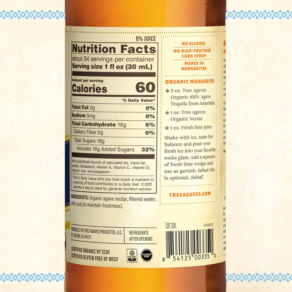 Tres Agaves Organic Agave Nectar is a cocktail-ready sweetener sourced from the same blue agave plants as Tres Agaves Tequila, making it an essential margarita ingredient. This ridiculously delicious, low calorie sweetener is a Beverage Tasting Institute Gold winner. Unlike other honey-like agave syrup sweeteners, this USDA Certified organic sweetener is balanced with just enough purified water so that it dissolves easily in cold beverages, like iced tea, margaritas or other cocktails. Agave nectar is also a great way to sweeten hot items like coffee, tea or even oatmeal. If you're out of margarita mix, simply combine this agave sweetener with tequila and lime juice for a fresh margarita in minutes. Sourced from Mexico's Tequila Valley, blue agave takes six to eight years to mature. After harvest, the agave is slow roasted to convert the starches to caramelizing sugars. Tres Agaves Organic Agave sweetener does not contain alcohol. In Tequila Valley, we trust.