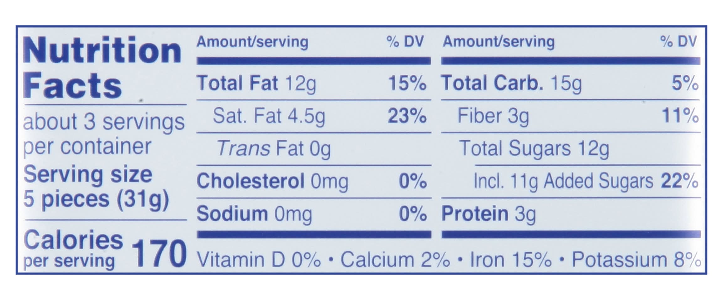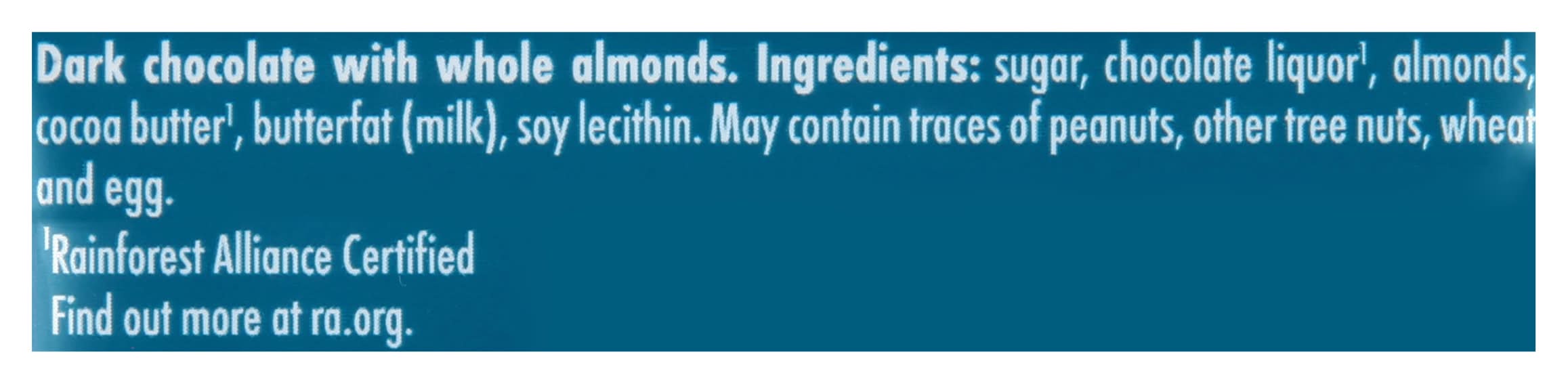 Ingredients: Sugar, Chocolate Liquor (Rainforest Alliance Certified), Almonds, Cocoa Butter (Rainforest Alliance Certified), Butterfat (Milk), Soy Lecithin Contains: Milk, Tree Nuts, Almonds, Soybeans, Peanuts, Tree Nuts, Eggs, Wheat