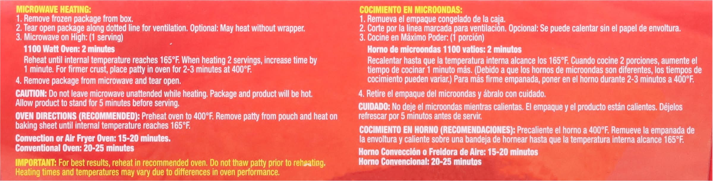 Directions for use: Microwave heating: 1. Remove frozen package from box. 2. Tear open package along dotted line for ventilation. Optional: may heat without wrapper 3. Microwave on high: (1 serving) 1100 watt oven: 2 minutes reheat until internal temperature reaches 165 degrees F. When heating 2 servings, increase time by 1 minute. For firmer crust, place patty in oven for 2-3 minutes at 400 degrees F. 4. Remove package from microwave and tear open. Oven directions (Recommended): Preheat oven to 400 degrees F, Remove patty from pouch and heat on baking sheet until internal temperature reaches 165 degrees F. Convection or air fryer Oven: 15-20 minutes. Conventional Oven: 20-25 minutes. Caution: Do not leave microwave unattended while heating. Package and product will be hot. Allow product to stand 5 minutes before serving. Important: For best results, reheat in recommended oven. Do not thaw patty prior to reheating. Heating times and temperatures may vary due to differences in oven performance. Storage recommendation: Keep frozen.