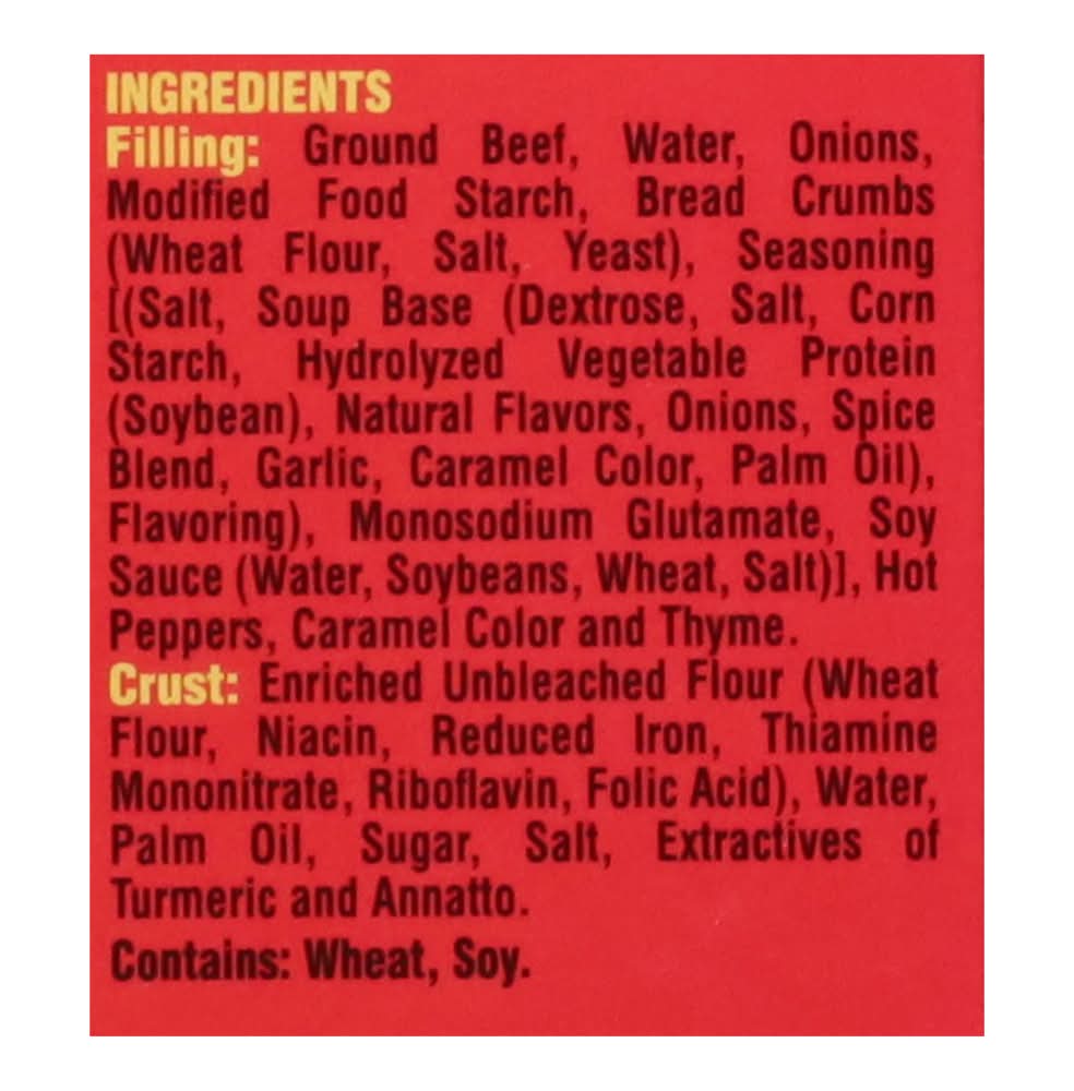 Ingredients: Ingredients Filling: Ground Beef, Water, Onions, Modified Food Starch, Bread Crumbs (Wheat Flour, Salt, Yeast), Seasoning [(Salt, Soup Base (Dextrose, Salt, Corn Starch, Hydrolyzed Vegetable Protein (Soybean), Natural Flavors, Onions, Spice Blend, Garlic, Caramel Color, Palm Oil), Flavoring), Monosodium Glutamate, Soy Sauce (Water, Soybeans, Wheat, Salt)], Hot Peppers, Caramel Color and Thyme. Crust: Enriched Unbleached Flour (Wheat Flour, Niacin, Reduced Iron, Thiamine Mononitrate, Riboflavin, Folic Acid), Water, Palm Oil, Sugar, Salt, Extractives of Turmeric and Annatto Contains: Wheat, Corn, Soybeans