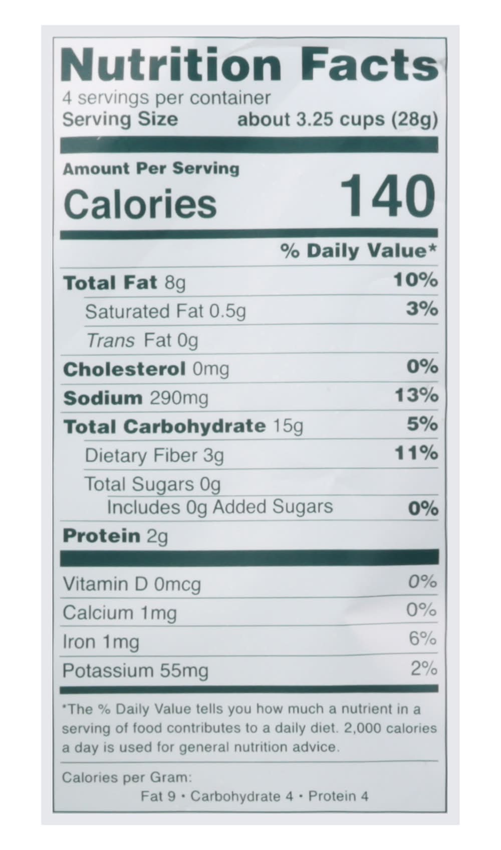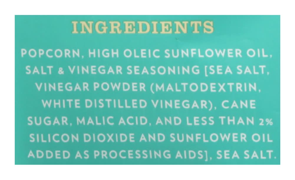 Ingredients: Popcorn, High Oleic Sunflower Oil, Salt & Vinegar Seasoning (Sea Salt, Vinegar Powder (Maltodextrin, White Distilled Vinegar), Cane Sugar, Malic Acid, and Less than 2% Silicon Dioxide and Sunflower Oil Added as Processing Aids), Sea Salt Contains: Soybeans, Milk, Peanuts, Tree Nuts