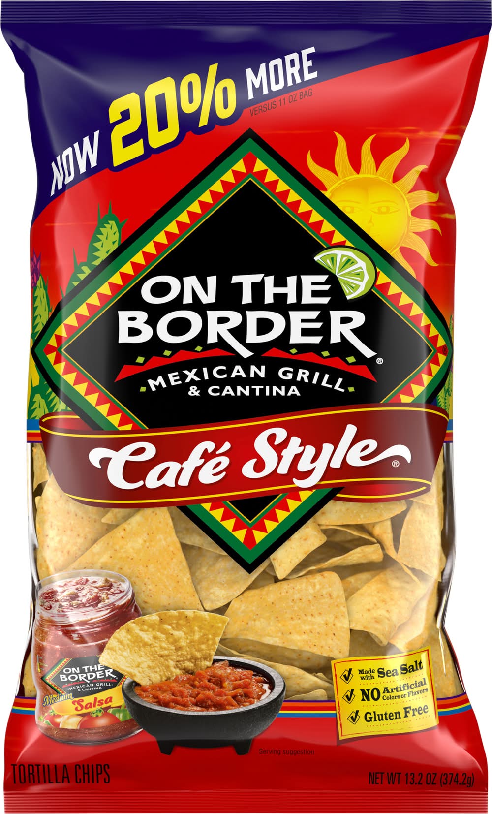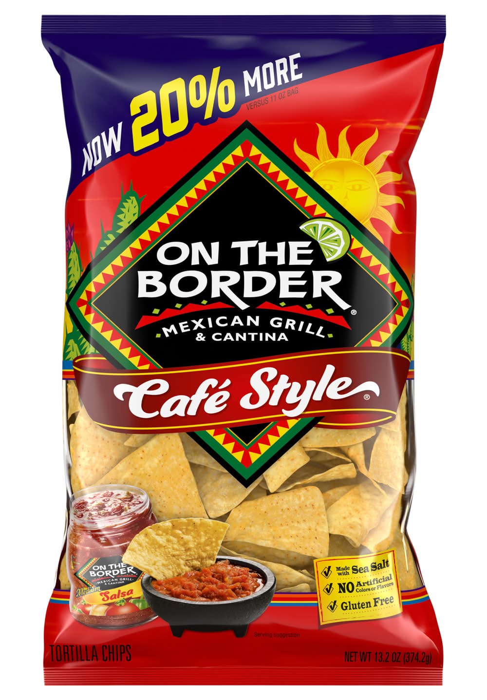 Tortilla chips that are made with simple ingredients such as corn, oil and sea salt. This product is free from artificial flavors, preservatives and added sugar. • Brand: On the border • Flavor: Cafe style • gluten-free • Truco Enterprises, LP, PO Box 671169, Dallas, TX, 75367-1169