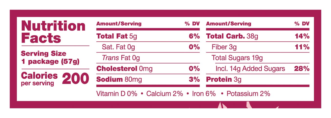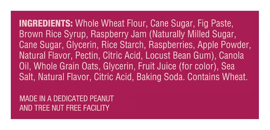 Ingredients: Whole Wheat Flour, Cane Sugar, Fig Paste, Brown Rice Syrup, Raspberry Jam (Naturally Milled Sugar, Cane Sugar, Glycerin, Rice Starch, Raspberries, Apple Powder, Natural Flavor, Pectin, Citric Acid, Locust Bean Gum), Canola Oil, Whole Grain Oats, Glycerin, Fruit Juice (for Color), Sea Salt, Natural Flavor, Citric Acid, Baking Soda Contains: Wheat, Oat