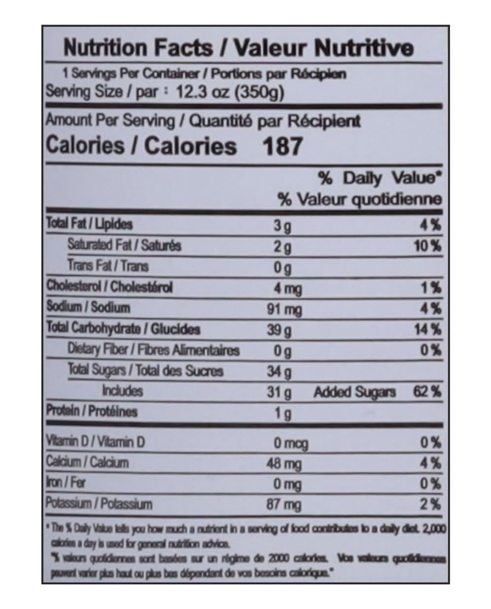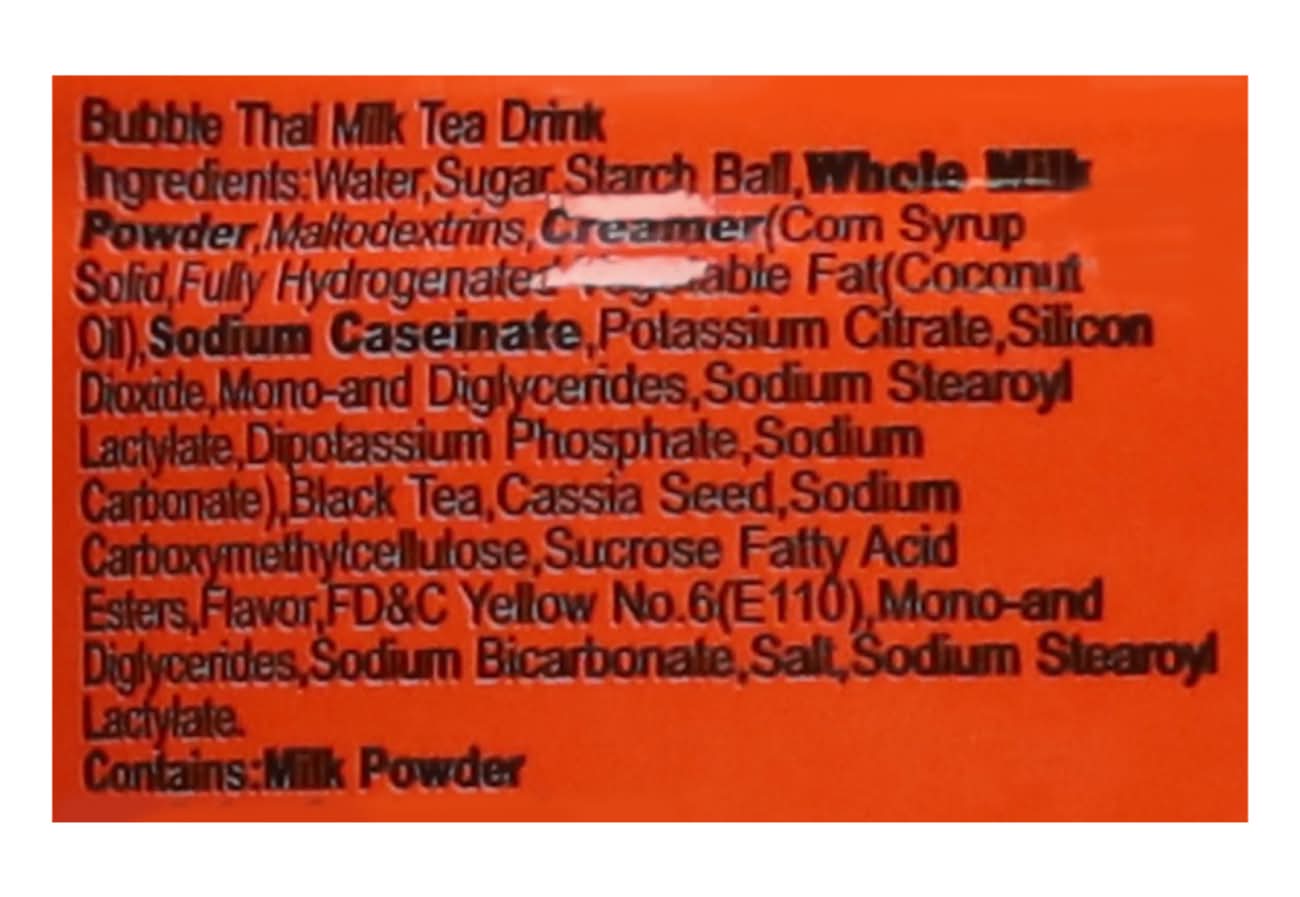 Ingredients: Water, Sugar, Starch Ball, Whole Milk Powder Maltodextrins, Creamer (Corn Syrup Solid, Fully Hydrogenated Vegetable Fat (Coconut Oil), Sodium Caseinate, Potassium Citrate, Silicon Dioxide, Mono-and Diglycerides, Sodium Stearoyl Lactylate, Dipotassium Phosphate, Sodium Carbonate), Black Tea, Cassia Seed, Sodium Carboxymethylcellulose, Sucrose Fatty Acid Esters, Flavor, FD&C Yellow No.6 (E110), Mono-and Diglycerides, Sodium Bicarbonate, Salt, Sodium Stearoyl Lactylate Contains: Milk, Corn, Tree Nuts, Coconuts, Peanuts, Gluten, Soybeans, Milk, Tree Nuts