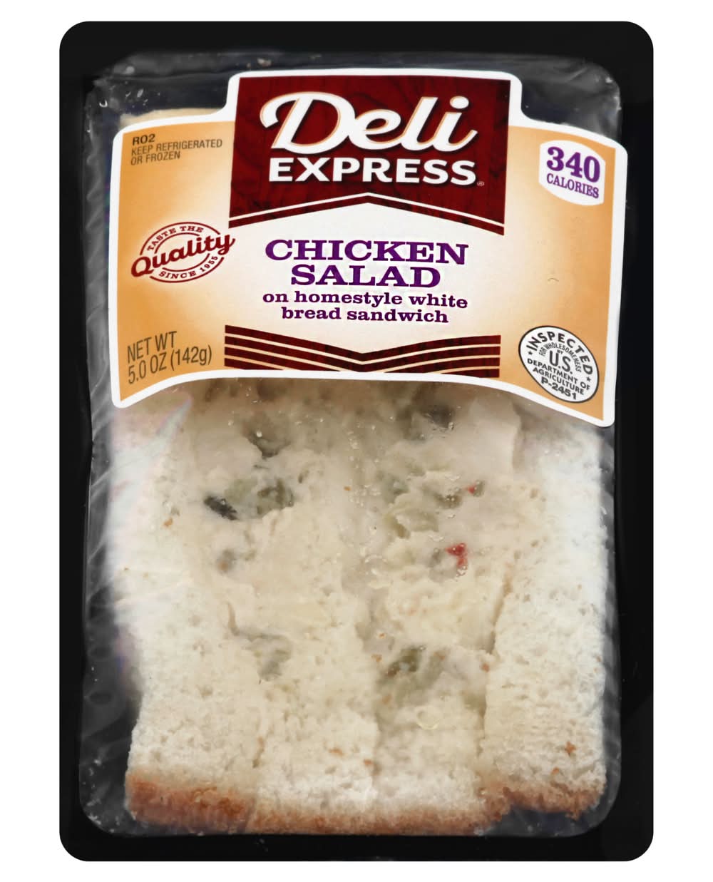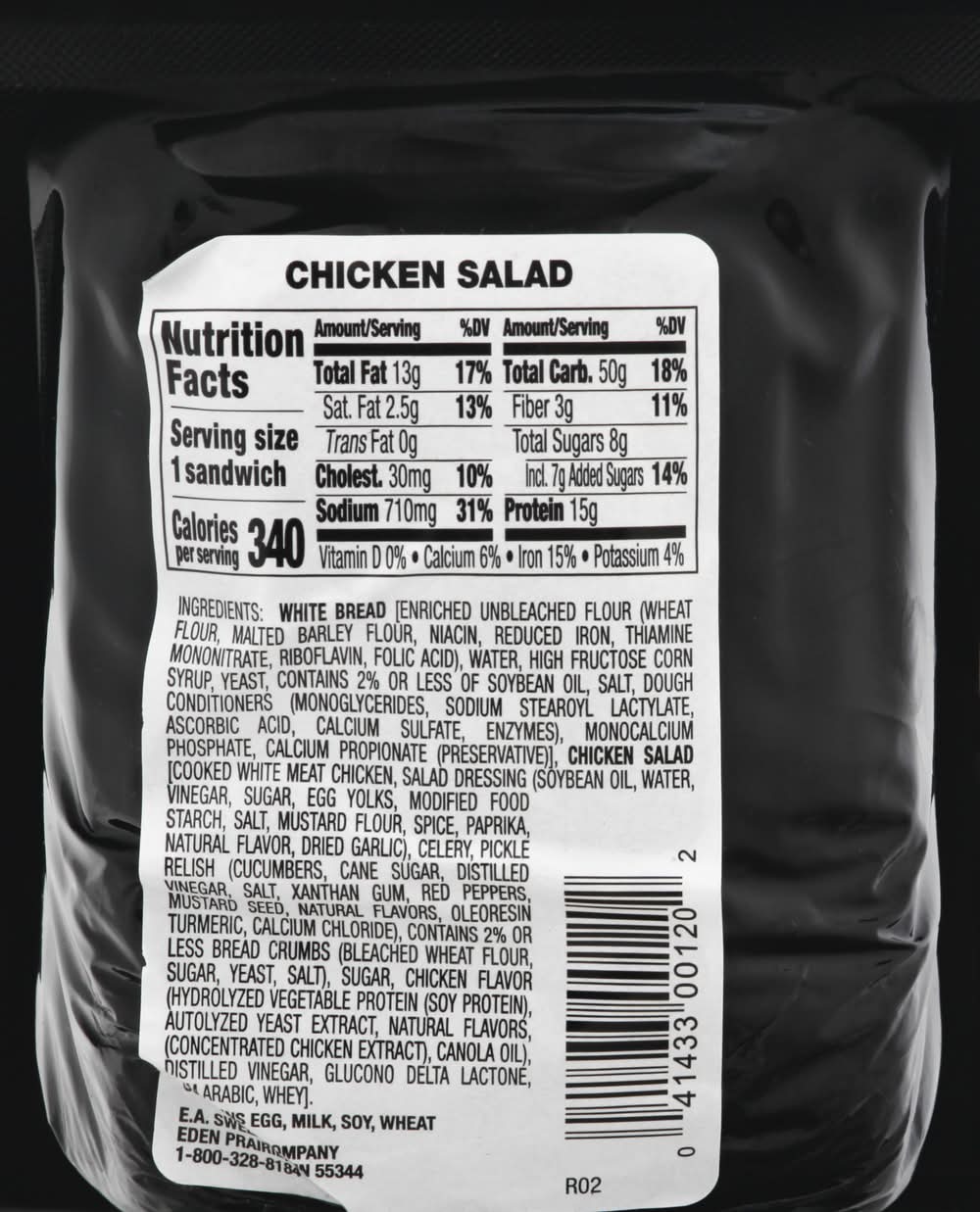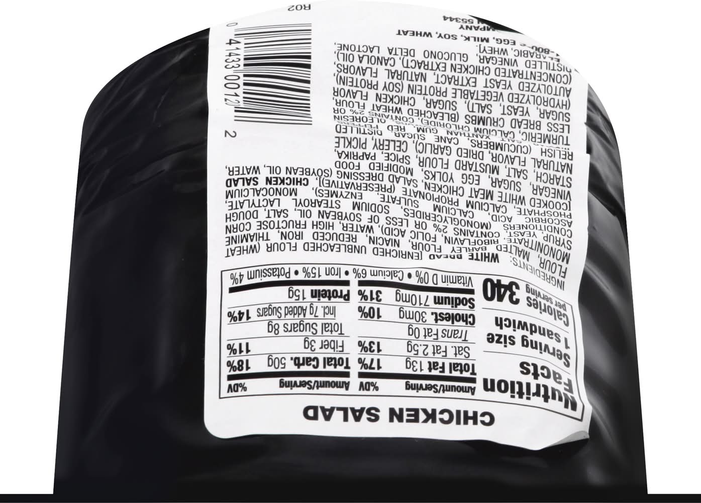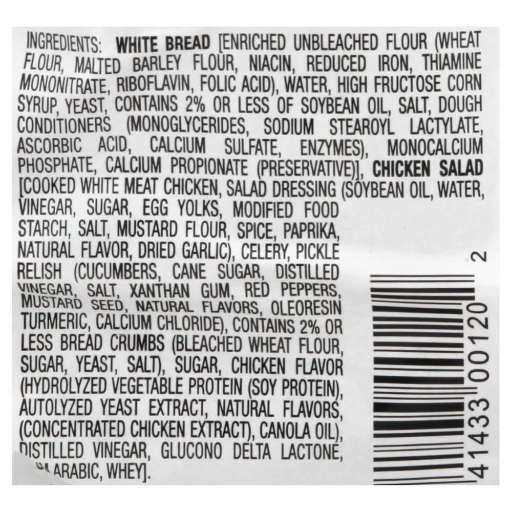Ingredients: White Bread [Enriched Unbleached Flour (Wheat Flour, Malted Barley Flour, Niacin, Reduced Iron, Thiamine Mononitrate, Riboflavin, Folic Acid), Water, High Fructose Corn Syrup, Yeast, Contains 2% or Less of Soybean Oil, Salt, Dough Conditioners (Monoglycerides, Sodium Stearoyl Lactylate, Ascorbic Acid, Calcium Sulfate, Enzymes), Monocalcium Phosphate, Calcium Propionate (Preservative)], Chicken Salad [Cooked White Meat Chicken, Salad Dressing (Soybean Oil, Water, Vinegar, Sugar, Egg Yolks, Modified Food Starch, Salt, Mustard Flour, Spice, Paprika, Natural Flavor, Dried Garlic), Celery, Pickle Relish (Cucumbers, Cane Sugar, Distilled, Vinegar, Salt, Xanthan Gum, Red Peppers, Mustard Seed, Natural Flavors, Oleoresin Turmeric, Calcium Chloride), Contain 2% or Less Bread Crumbs (Bleached Wheat Flour, Sugar, Yeast, Salt), Sugar, Chicken Flavor (Hydrolyzed Vegetable Protein (Soy Protein), Autolyzed Yeast Extract, Natural Flavors, (Concentrated Chicken Extract), Canola Oil), Distilled Vinegar, Glucono Delta Lactone, Gum Arabic, Whey] Contains: Eggs, Milk, Soybeans, Wheat