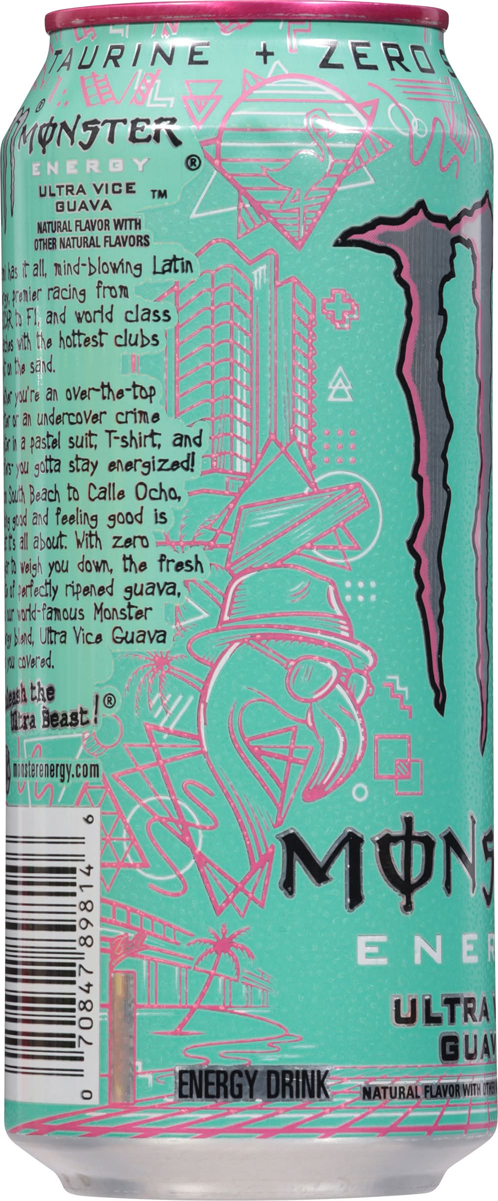Natural flavor with other natural flavors. 0 sugar per can. Taurine + zero sugar + l-carnitine. Monster energy ultra vice guava is low in calories. Monster energy blend: taurine, l-carnitine, caffeine, inositol caffeine from all sources: 150 mg per can. Miami has it all, mind-blowing latin energy, premier racing from nascar to f1, and world class beaches with the hottest clubs right on the sand. Whether you're an over-the-top partier or an undercover crime fighter in a pastel suit; t-shirt, and loafers- you gotta stay energized! • Brand: Monster energy • Flavor: Ultra vice guava • Packaging: Reusable