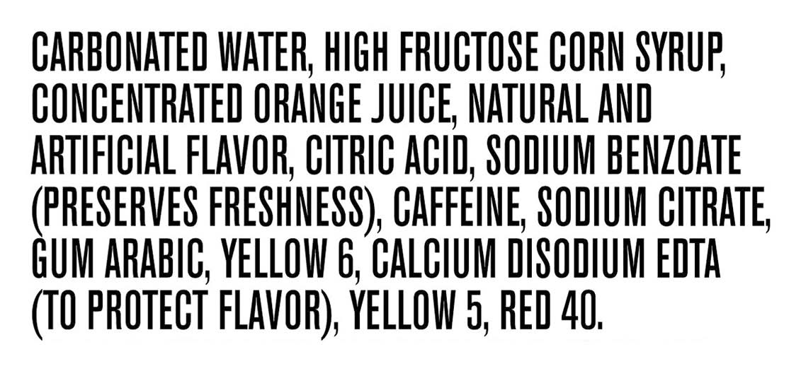 Ingredients: Carbonated Water, High Fructose Corn Syrup, Concentrated Orange Juice, Natural and Artificial Flavor, Citric Acid, Sodium Benzoate (Preserves Freshness), Caffeine, Sodium Citrate, Gum Arabic, Yellow 6, Calcium Disodium EDTA (to Protect Flavor), Yellow 5, Red 40 Contains: Corn