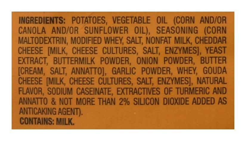 Ingredients: Potatoes, Vegetable Oil (Corn and/or Canola and/or Sunflower Oil), Seasoning (Corn Maltodextrin, Modified Whey, Salt, Nonfat Milk, Cheddar Cheese [Milk, Cheese Cultures, Salt, Enzymes], Yeast Extract, Buttermilk Powder, Onion Powder, Butter [Cream, Salt, Annatto], Garlic Powder, Whey, Gouda Cheese [Milk, Cheese Cultures, Salt, Enzymes], Natural Flavor, Sodium Caseinate, Extractives of Turmeric and Annatto & Not More than 2% Silicon Dioxide Added as Anticaking Agent) Contains: Milk