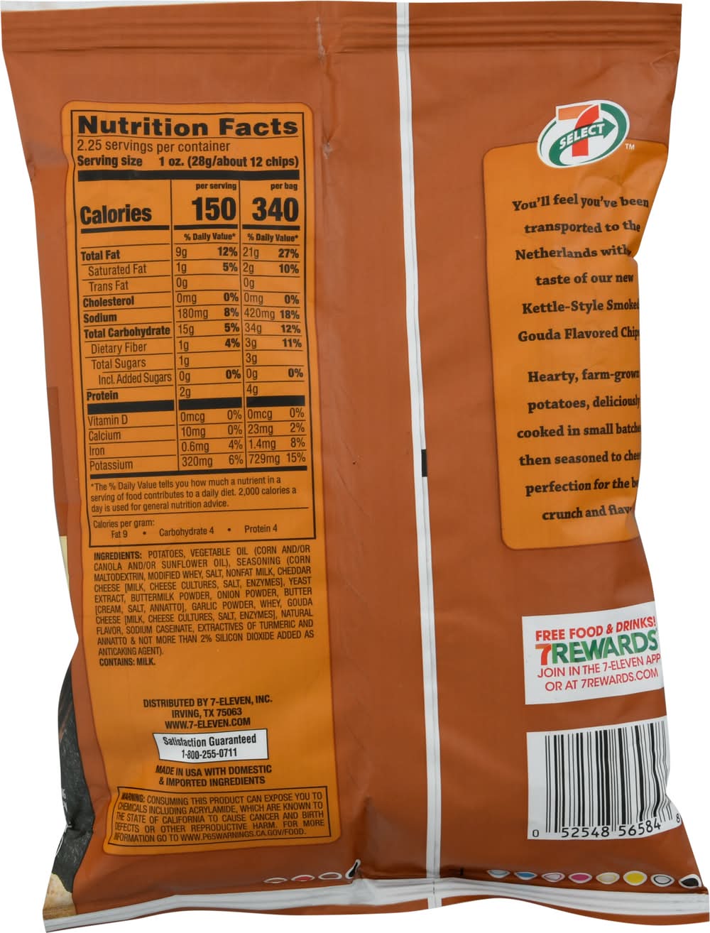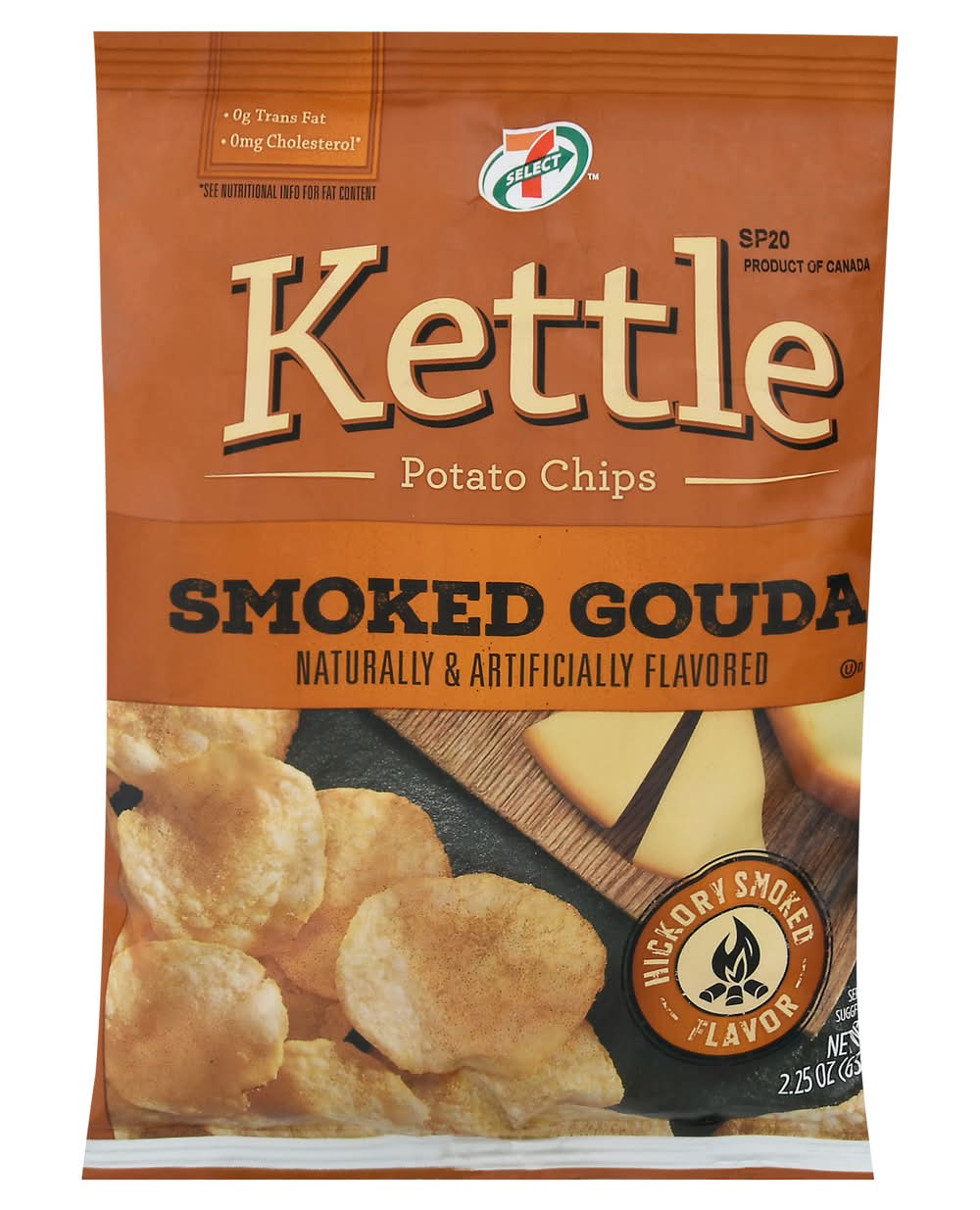 Hickory smoked flavor. Naturally & artificially flavored. 0 g Trans fat. 0 mg Cholesterol (see nutrition info for fat content). You'll feel you've been transported to the Netherlands with one taste of our new Kettle-Style Smoked Gouda Flavored Chips. Hearty, farm-grown potatoes, deliciously cooked in small batches, then seasoned to cheesy perfection for the best crunch and flavor. • Brand: 7-select • Flavor: Smoked gouda • kosher