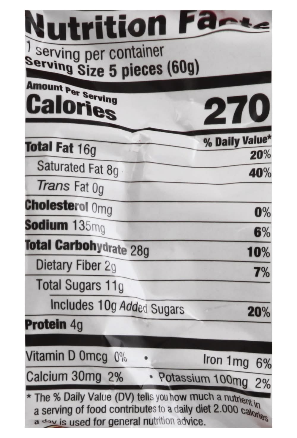 Ingredients: Dough: Wheat Flour, Vegetable Oils (Palm Oil, Sunflower Oil), Water, Sugar, Yeast, Salt, Mono and Diglycerides of Fatty Acids, Vanillin Artificial Flavor, Citric Acid, Calcium Propionate, Potassium Sorbate (Preservative), Chocolate Cream Filling: Sugar, Palm Oil, Low Fat Cocoa Powder, Nonfat Dry Milk, Ethyl Alcohol, Polyglycerol Esters of Fatty Acids, Vanillin Artificial Flavor, Sodium Alginate, Potassium Sorbate (Preservative) Contains: Wheat, Milk, Eggs, Peanuts, Tree Nuts, Sesame