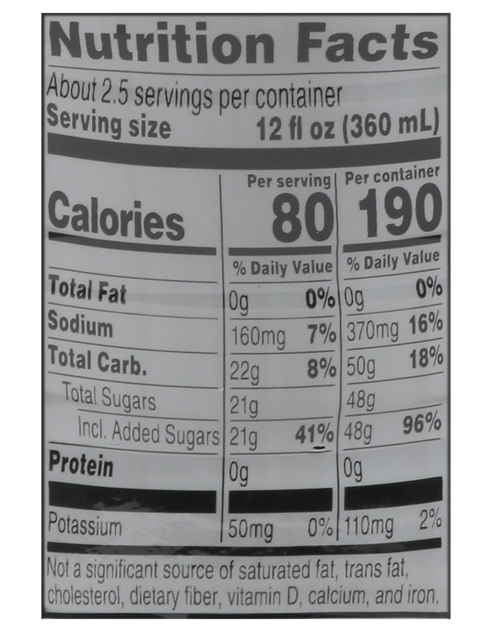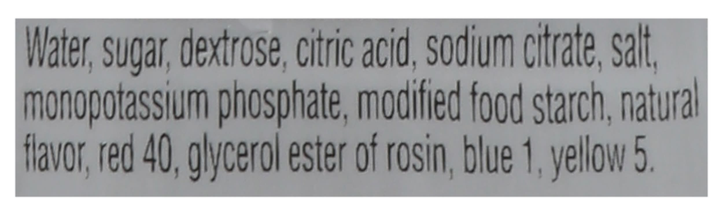Ingredients: Water, Sugar, Dextrose, Citric Acid, Sodium Citrate, Salt, Monopotassium Phosphate, Modified Food Starch, Natural Flavor, Red 40, Glycerol Ester Of Rosin, Blue 1, Yellow 5