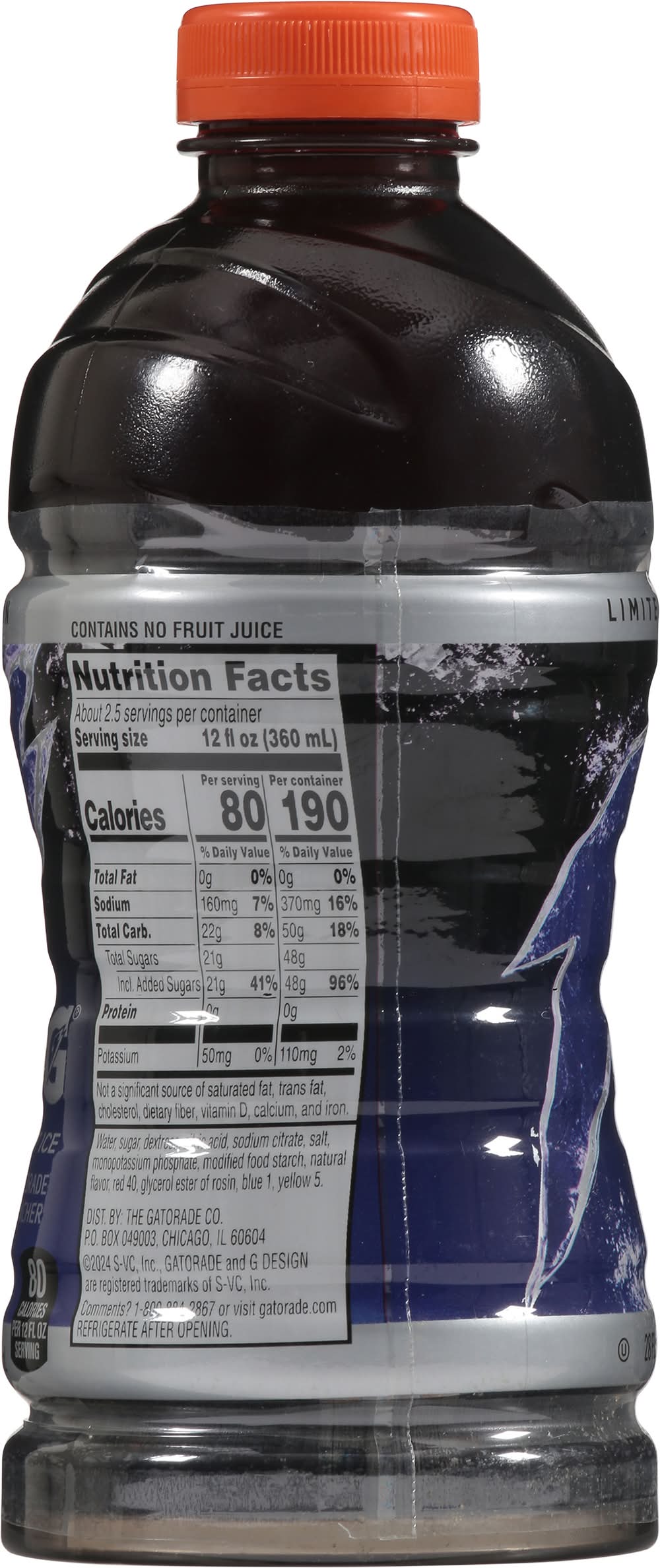 Light, crisp refreshing citrus punch flavored sports drink with electrolytes to replenish yourself after heavy workout activity. • Brand: Gatorade • Flavor: Midnight ice • kosher