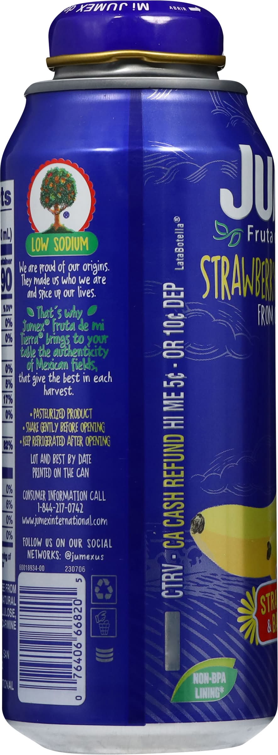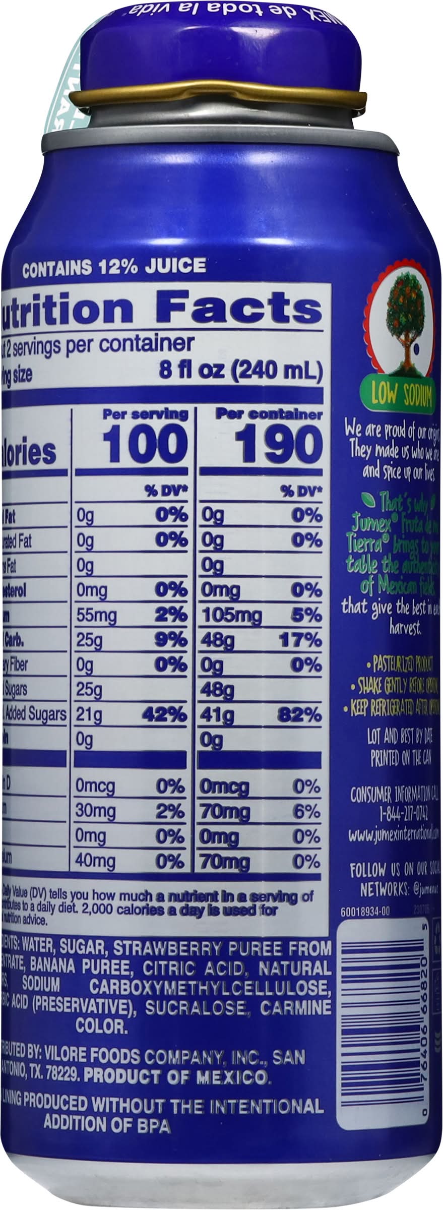 Low sodium. Tasty strawberries & bananas. We are proud of our origins. They made us who we are and spice up our lives. That's why de mi Tierra brings to your table the authenticity of Mexican fields, that give the best in each harvest. • Brand: Jumex • Flavor: Strawberry-banana • low sodium • Number of servings: 2 • Packaging: Reusable