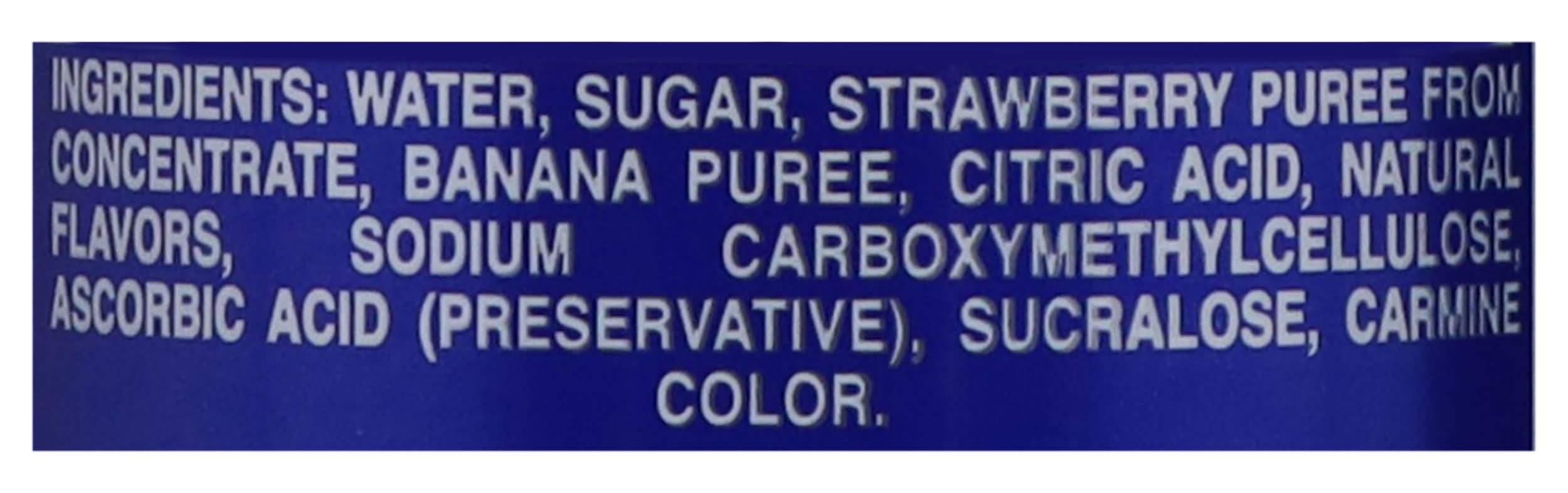 Ingredients: Water, Sugar, Strawberry Puree from Concentrate, Banana Puree, Citric Acid, Natural Flavors, Sodium Carboxymethylcellulose, Ascorbic Acid (Preservative), Sucralose, Carmine Color