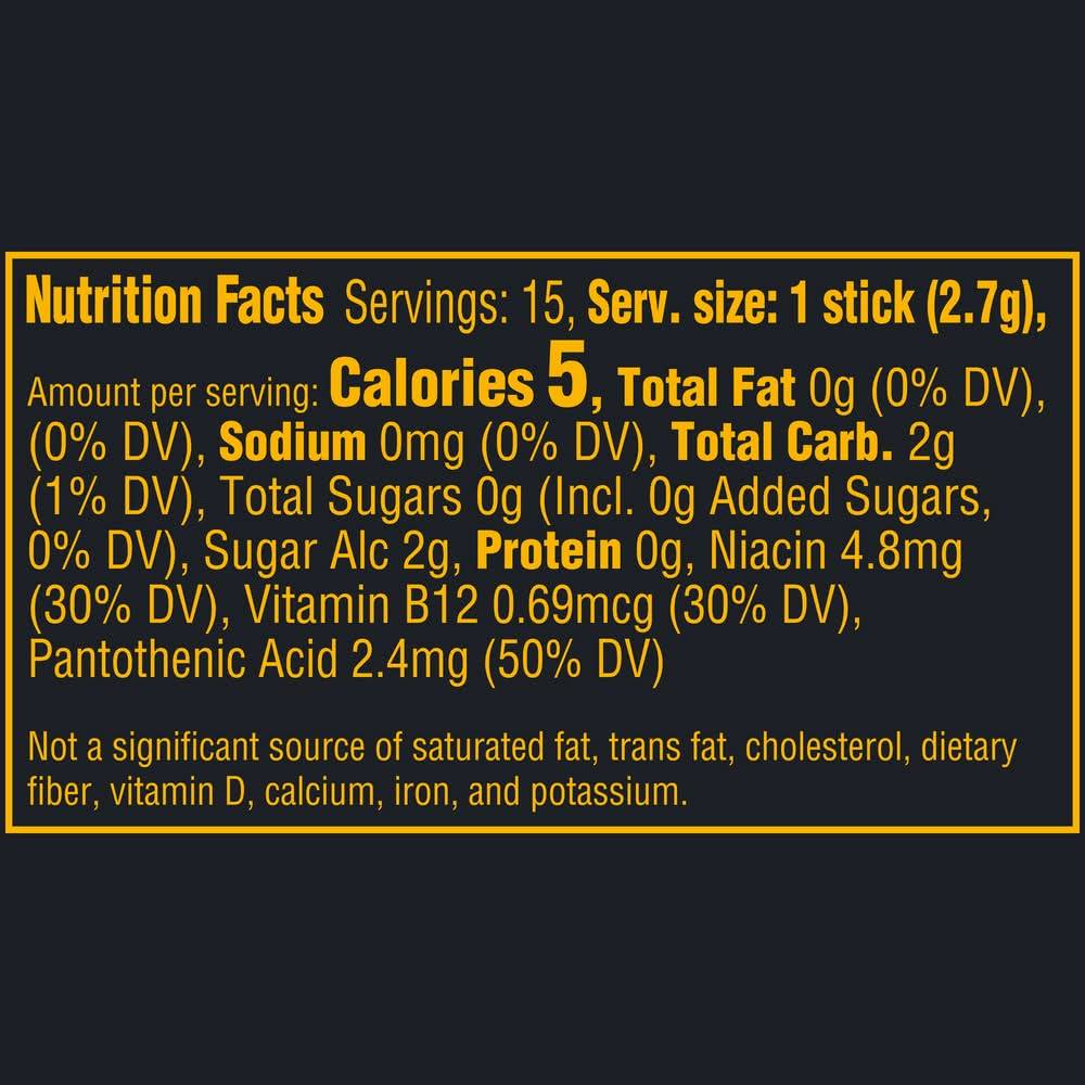 Ingredients: SORBITOL, GUM BASE, GLYCEROL; LESS THAN 2% OF: NATURAL AND ARTIFICIAL FLAVORS, HYDROGENATED STARCH HYDROLYSATE, CHOLINE CHLORIDE, L-THEANINE, SOY LECITHIN, CITRIC ACID, GREEN TEA EXTRACT, MALIC ACID, MANNITOL, ASPARTAME, COLORS (BLUE 2 LAKE, YELLOW 6 LAKE, RED 40 LAKE), NIACINAMIDE, POTASSIUM CHLORIDE, SODIUM CITRATE, ACESULFAME K, SUCRALOSE, CORN MALTODEXTRIN, VITAMIN B12 (CYANOCOBALAMIN), VITAMIN B5 (PANTOTHENIC ACID), VITAMIN B6 (PYRIDOXINE HYDROCHLORIDE), BHT (TO MAINTAIN FRESHNESS). Contains: Soybeans