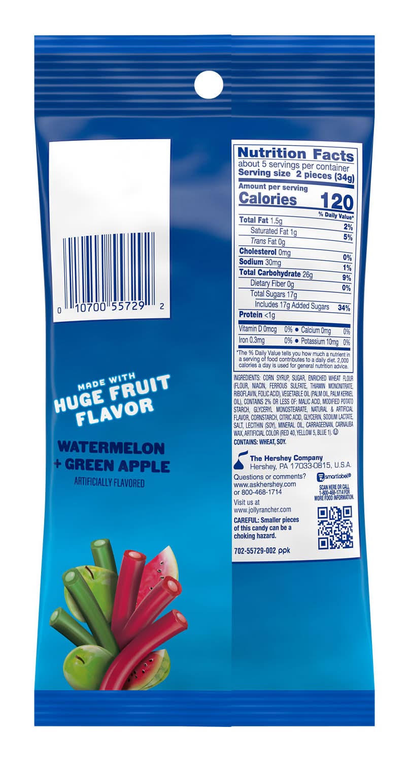Experience the impossibly fruity flavor of classic candy – now in an all new chewy treat. Ropes candies feature a chewy outer layer with a soft filling. Both layers pack a huge watermelon or green apple flavor that will take your taste buds by storm. These candies are the perfect balance of soft, chewy and bold, all wrapped up into the longest treat ever made. Your friends and family will be begging you to share these iconic candies – but don't be afraid to keep a few for yourself. This bag includes Ropes watermelon flavored candy and Ropes green apple flavored candy. Ropes candy is the perfect treat to tuck in lunch boxes, backpacks and desk drawers for whenever you want a powerful punch of fruity flavor. Share a bag with friends and family at your next movie night or offer them up after a long day outside or on the go. These colorful candies are perfect for enjoying during the holidays, too. Use these bags of Ropes candies to stuff Christmas stockings, Easter baskets, Valentine's Day gift bags and Halloween trick or treat bags. Feeling creative in the kitchen? Enjoy these treats any day of the year chopped up on top of an ice cream sundae or placed on top of cookies, cakes and more. • Brand: Jolly rancher • Flavor: Watermelon-green apple