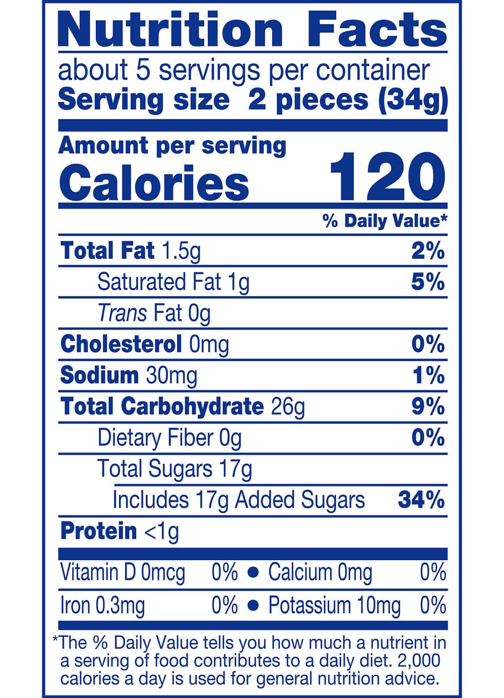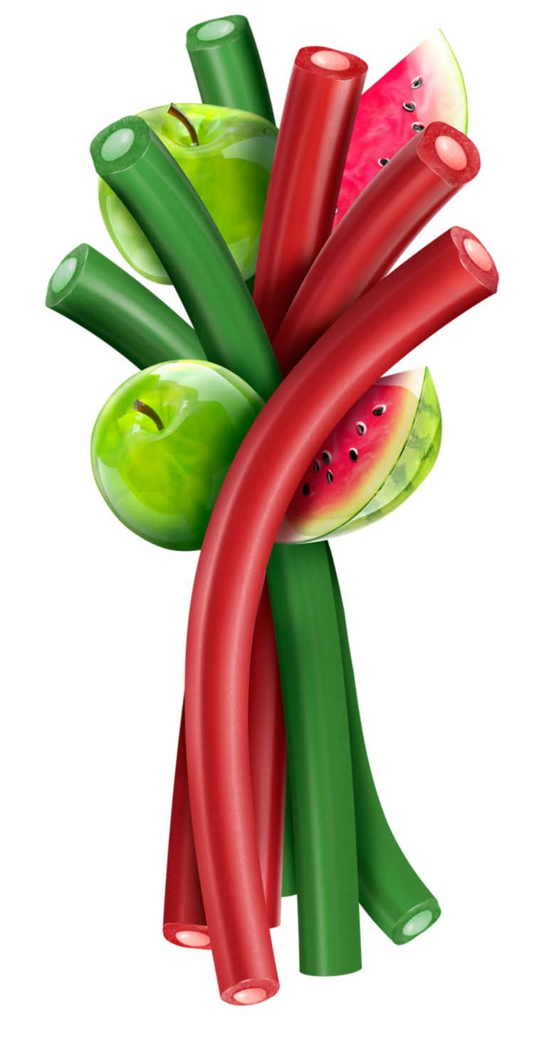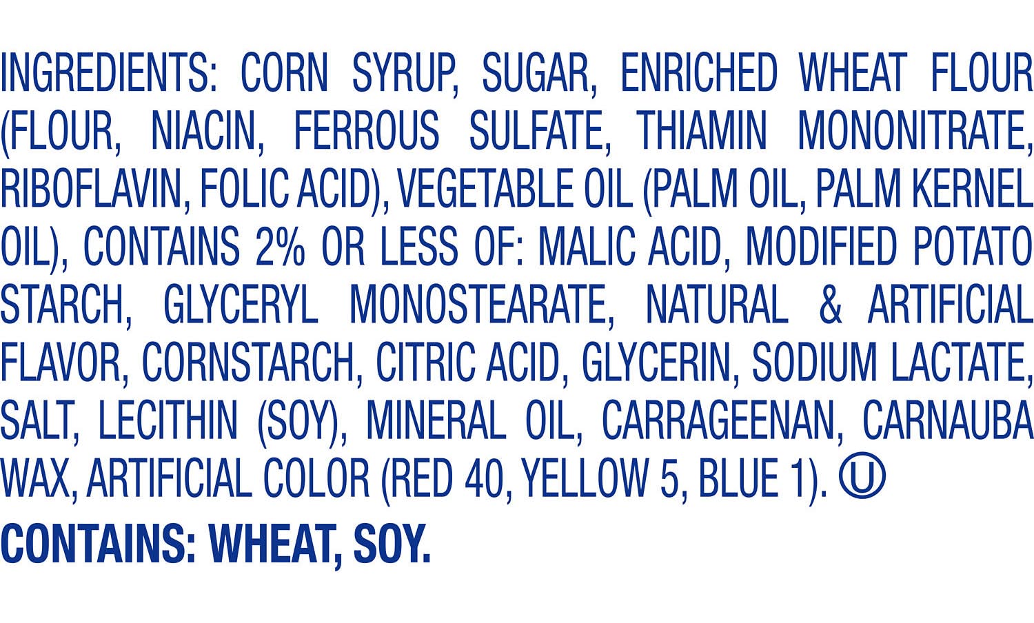 Ingredients: CORN SYRUP, SUGAR, ENRICHED WHEAT FLOUR (FLOUR, NIACIN, FERROUS SULFATE, THIAMIN MONONITRATE, RIBOFLAVIN, FOLIC ACID), VEGETABLE OIL (PALM OIL, PALM KERNEL OIL), CONTAINS 2% OR LESS OF: MALIC ACID, MODIFIED POTATO STARCH, GLYCERYL MONOSTEARATE, NATURAL ARTIFICIAL FLAVOR, CORNSTARCH, CITRIC ACID, GLYCERIN, SODIUM LACTATE, SALT, LECITHIN (SOY), MINERAL OIL, CARRAGEENAN, CARNAUBA WAX, ARTIFICIAL COLOR (RED 40, YELLOW 5, BLUE 1), . Contains: Wheat, Soybeans