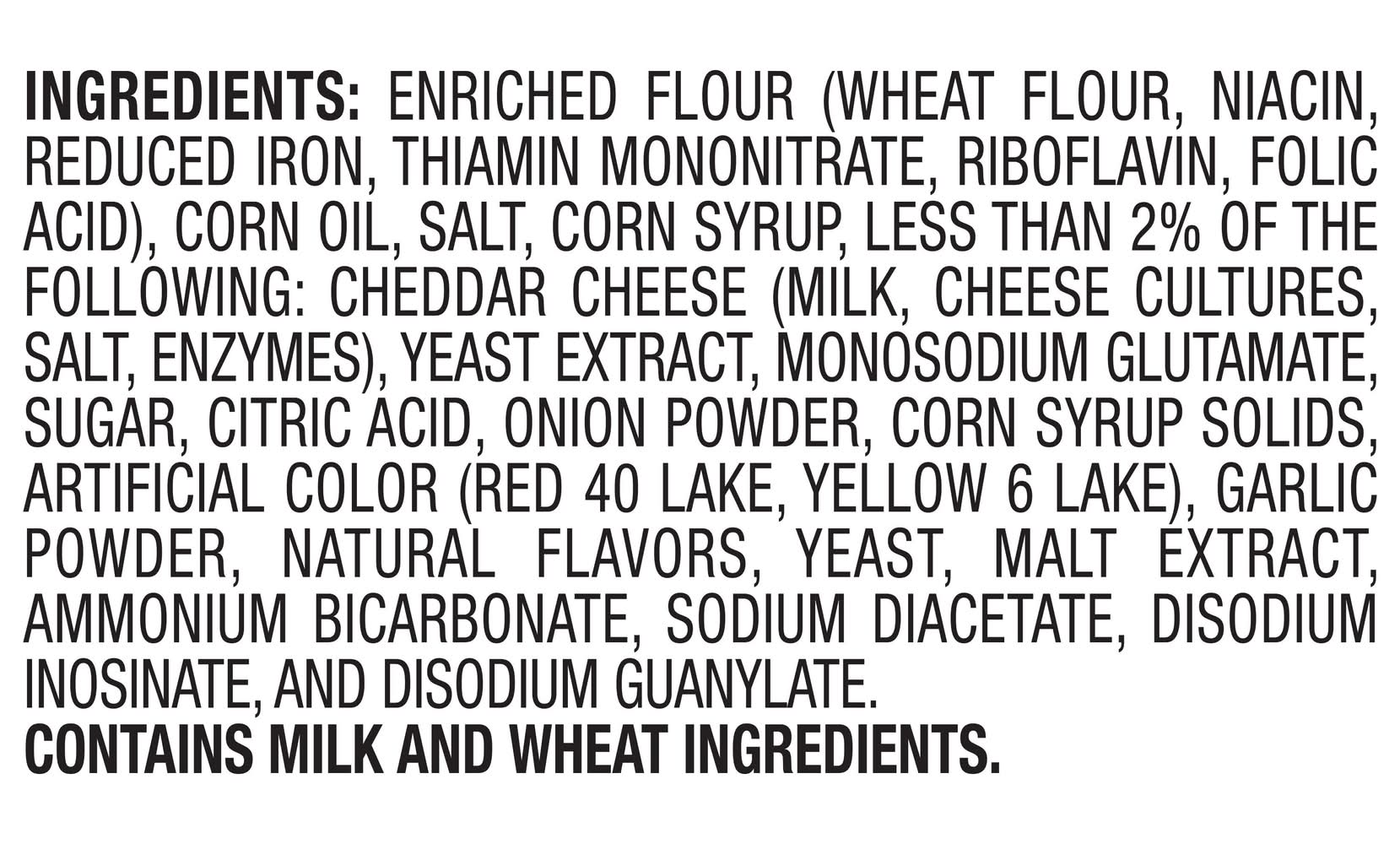 Ingredients: Enriched Flour (Wheat Flour, Niacin, Reduced Iron, Thiamin Mononitrate, Riboflavin, Folic Acid), Corn Oil, Salt, Corn Syrup, Less Than 2% Of The Following: Cheddar Cheese (Milk, Cheese Cultures, Salt, Enzymes), Yeast Extract, Monosodium Glutamate, Sugar, Citric Acid, Onion Powder, Corn Syrup Solids, Artificial Color (Red 40 Lake, Yellow 6 Lake), Garlic Powder, Natural Flavors, Yeast, Malt Extract, Ammonium Bicarbonate, Sodium Diacetate, Disodium Inosinate, And Disodium Guanylate. CONTAINS MILK AND WHEAT INGREDIENTS. Contains: Contains Milk, Wheat Ingredients.