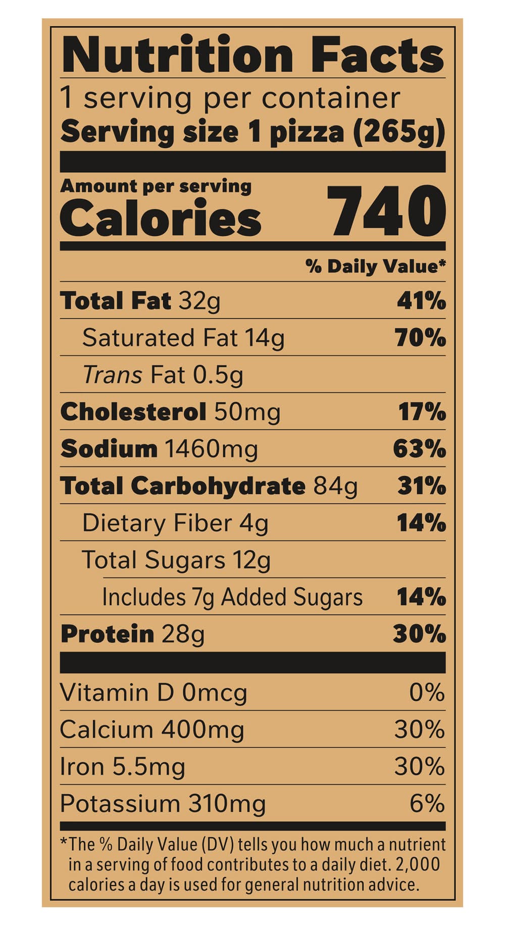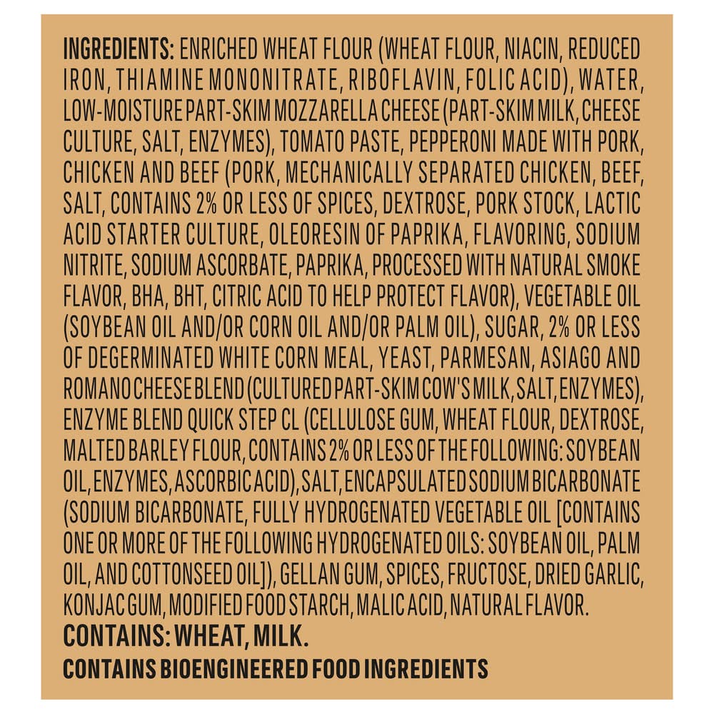 Ingredients: Enriched Wheat Flour (Wheat Flour Niacin Reduced Iron Thiamine Mononitrate Riboflavin Folic Acid) Water Low-Moisture Part-Skim Mozzarella Cheese (Part-Skim Milk Cheese Culture Salt Enzymes) Tomato Paste Contains: Wheat, Milk, Barley, Corn, Soybeans