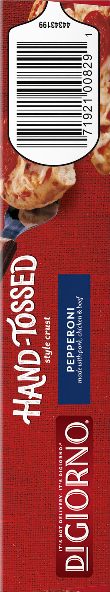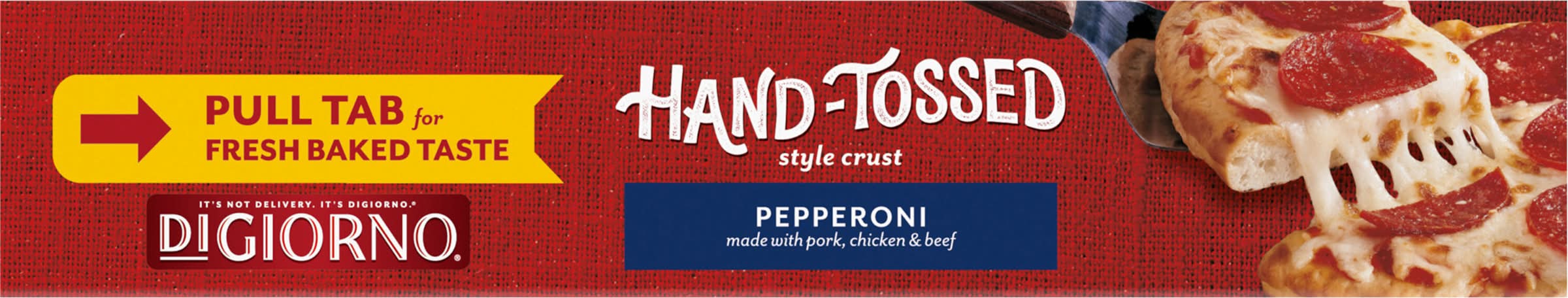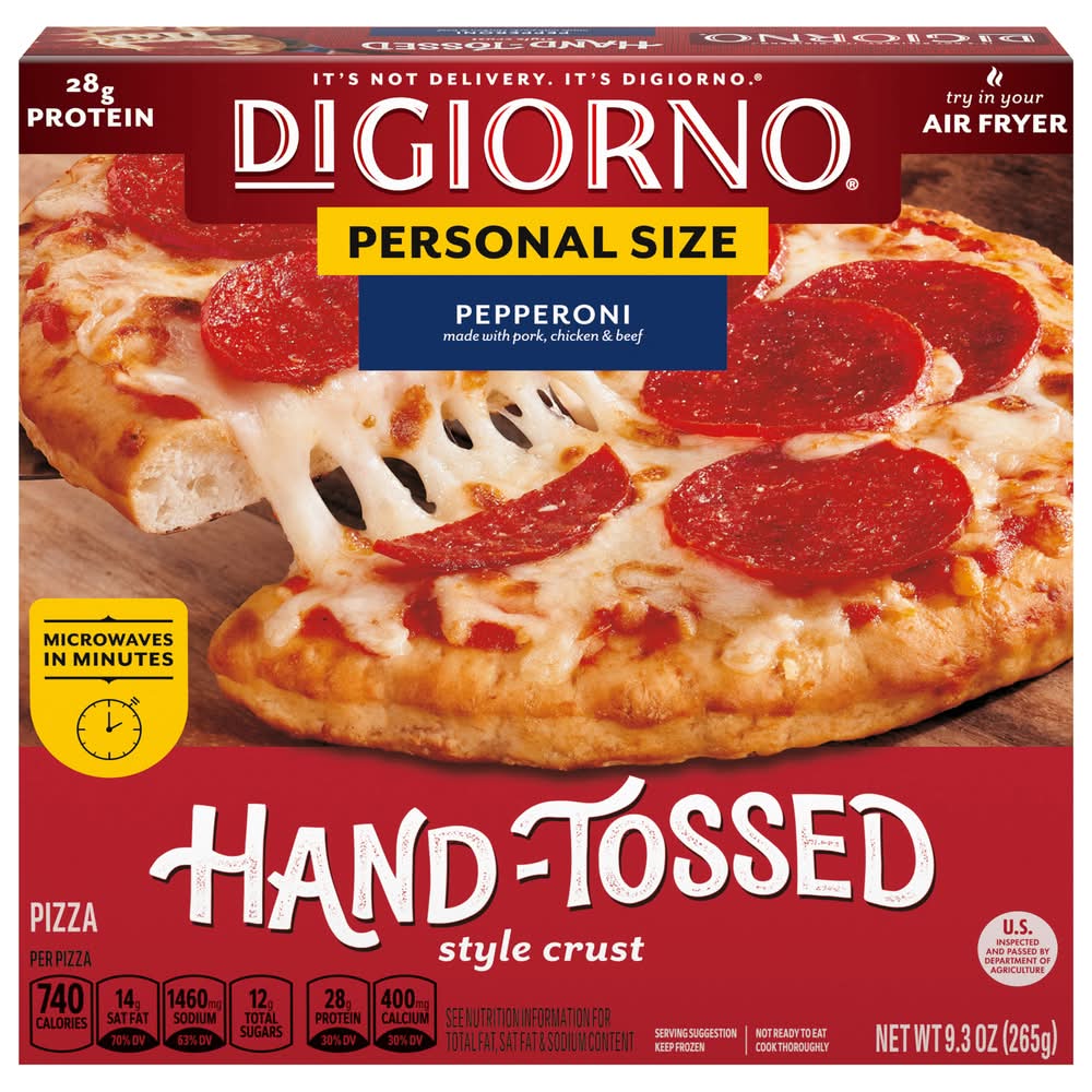 DiGiorno Pepperoni Frozen Personal Pizza on a Hand-Tossed Style Traditional Crust is created with the same great taste you love, but in a smaller size so you don't have to share. This small pizza is topped with tasty pepperoni and made with real mozzarella cheese, delivering a delicious, easy dinner. DiGiorno hand-tossed style pizza crust is a traditional favorite because it's crispy yet soft and airy on the inside for a truly satisfying personal pizza. Plus, this microwave pizza features a new and improved, tastier crust. This frozen pepperoni pizza is made with real cheese, pepperoni made from pork, chicken, and beef, and contains 27 grams of protein. Enjoy a quick lunch or dinner with a small frozen pizza just for you, straight from your oven. This small pizza is also great in an air fryer. Keep this DiGiorno pepperoni pizza frozen until you're ready to enjoy. It's not delivery. It's DiGiorno. Brand: Digiorno