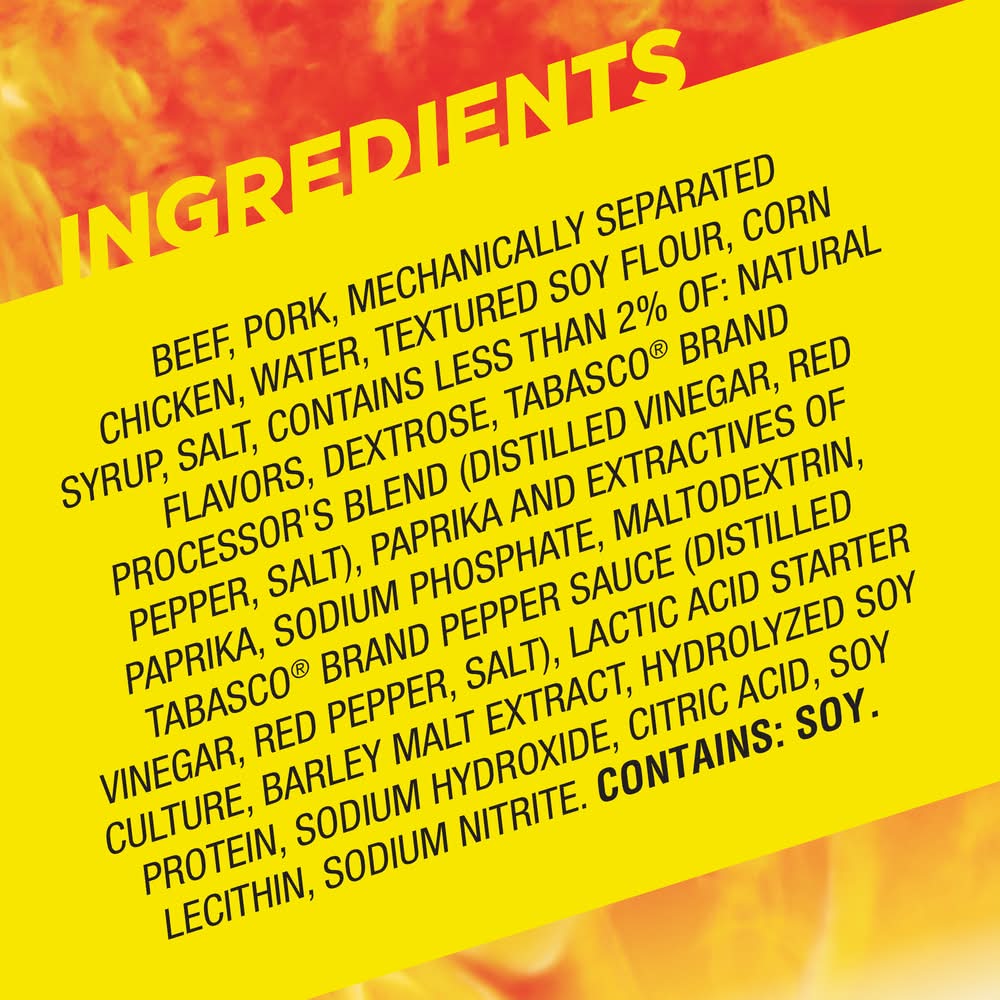 Ingredients: Beef, Pork, Mechanically Separated Chicken, Water, Textured Soy Flour, Corn Syrup, Salt, Contains less than 2% of: Natural Flavors, Dextrose, TABASCO® Brand Processor's Blend (Distilled Vinegar, Red Pepper, Salt), Paprika and Extractives of Paprika, Sodium Phosphate, Maltodextrin, TABASCO® Brand Pepper Sauce (Distilled Vinegar, Red Pepper, Salt), Lactic Acid Starter Culture, Barley Malt Extract, Hydrolyzed Soy Protein, Sodium Hydroxide, Citric Acid, Soy Lecithin, Sodium Nitrite. CONTAINS: SOY. Contains: Mustard (Canada and EU), Soy