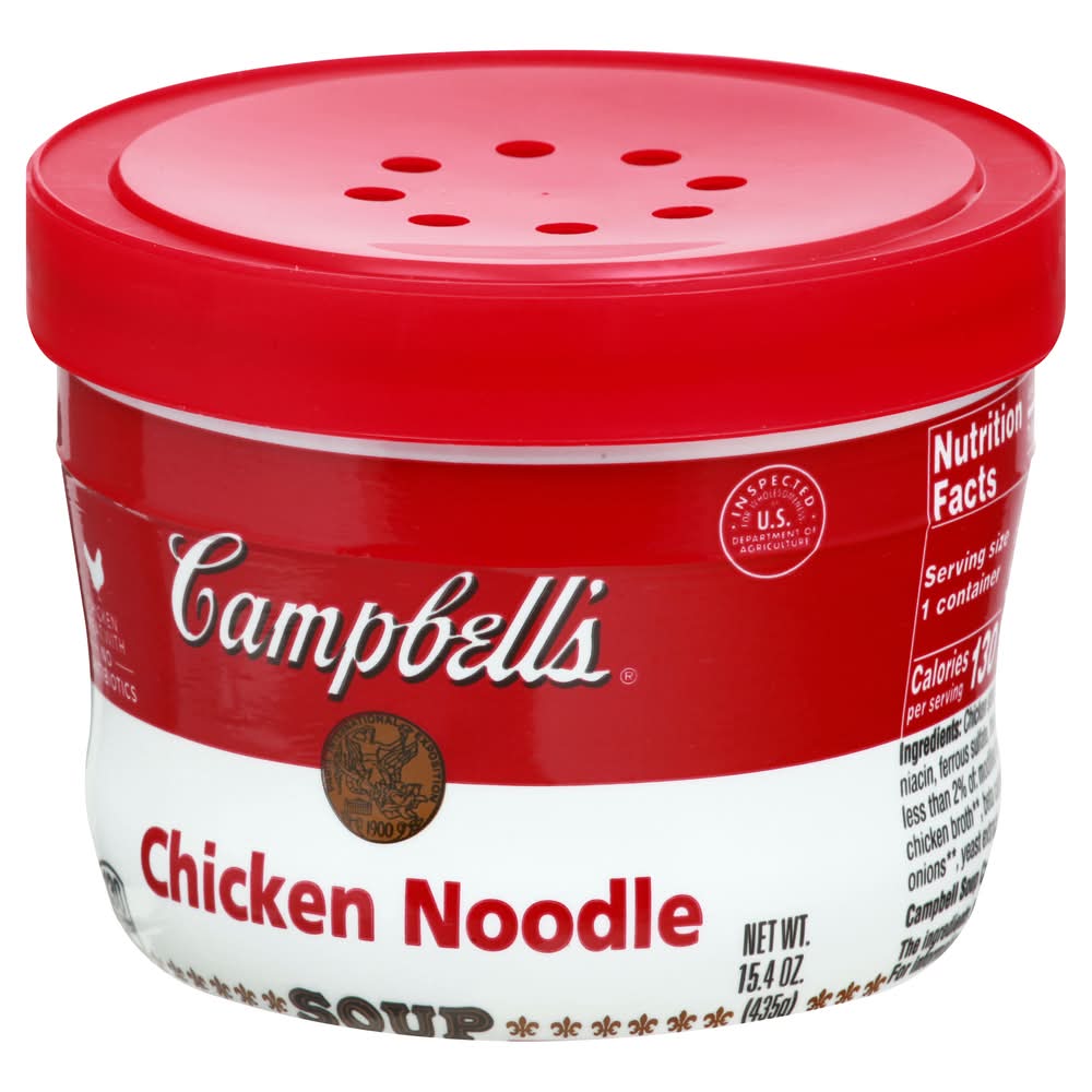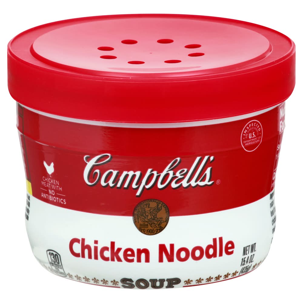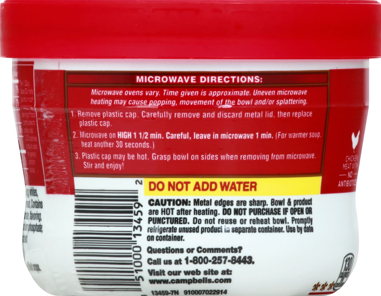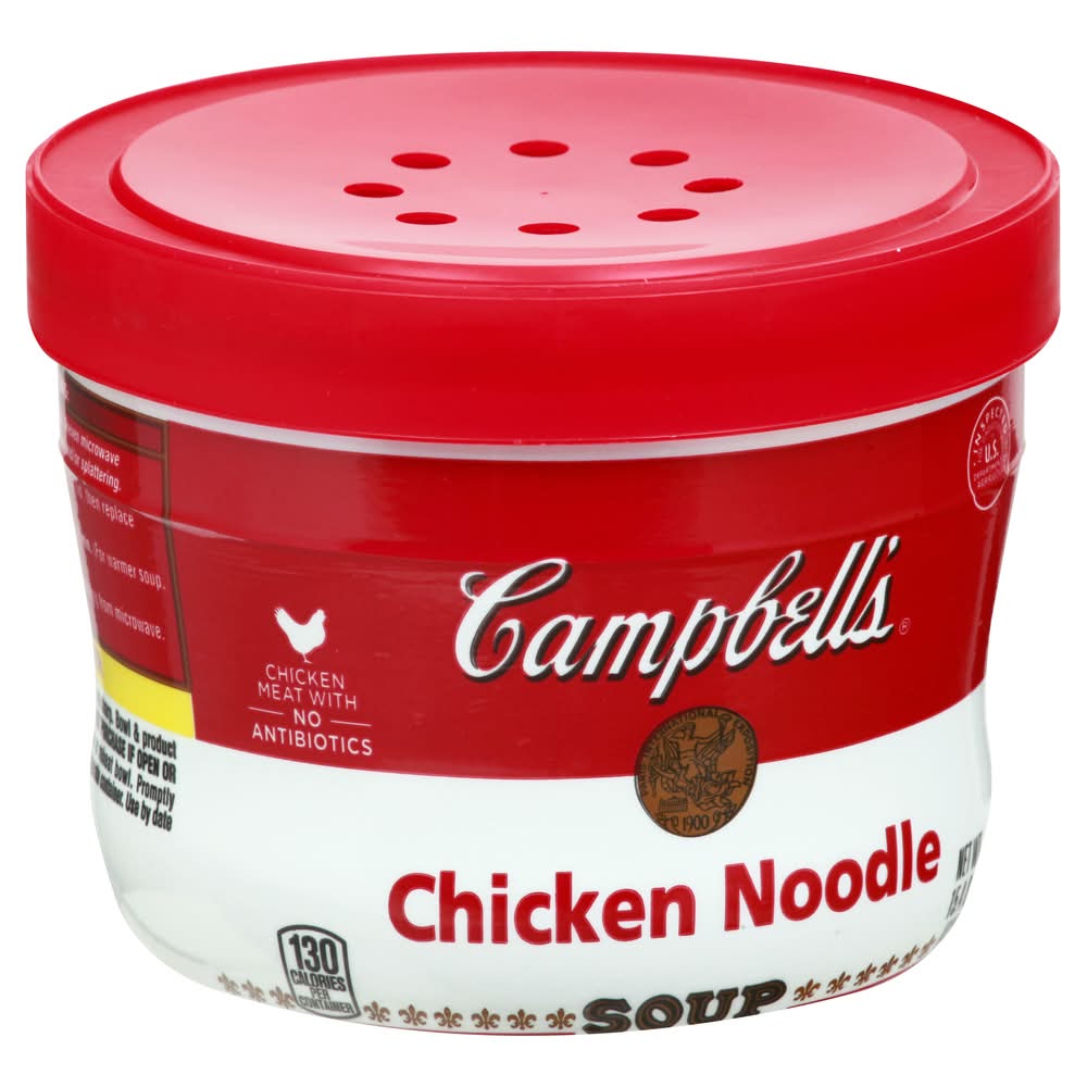 Take this twist on classic flavors you know and love on the road with Campbell's Chicken Noodle Soup. Every spoonful of this comforting chicken soup is crafted with delicious ingredients you grew up on. The savory taste of seasoned chicken broth, egg noodles and tender chicken meat with no antibiotics makes this soup a delicious and nostalgic choice anytime, anywhere. This chicken soup is made without high fructose corn syrup for a snack you can feel good about. Just pop off the cap, peel back the cover, replace the cap and microwave for one minute and 30 seconds. Let this easy to microwave soup sit for one minute and enjoy! Take this instant soup on the go for an easy, portable snack, appetizer or side dish for a delicious lunch. The microwavable soup bowl makes it easy to enjoy, no dishes required. Embark on your next adventure with Campbell's soups along for the ride. M'm M'm Good! • Brand: Campbell's • Campbell Soup Company, Camden,NJ,USA • Packaging: Reusable