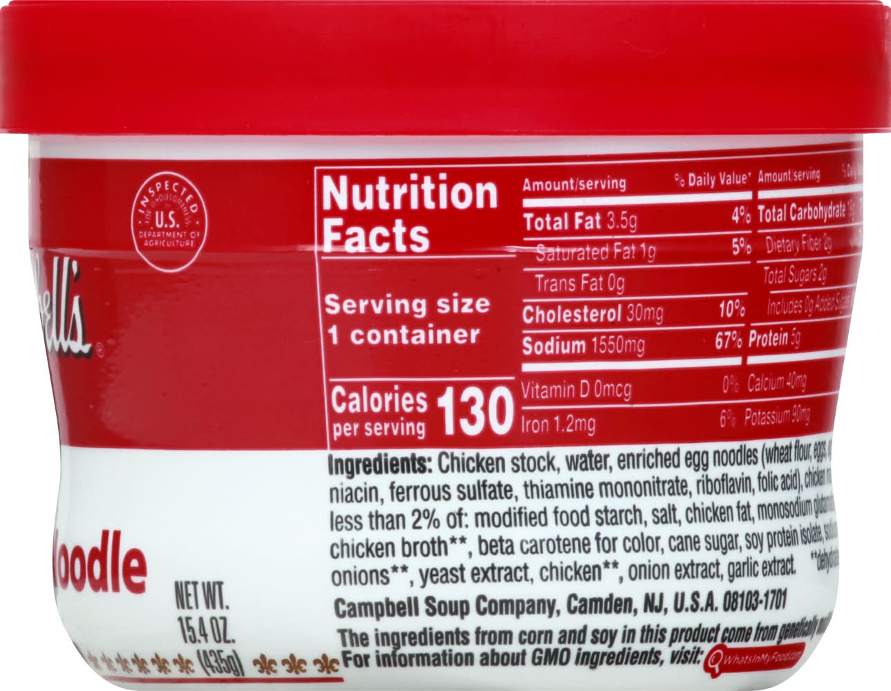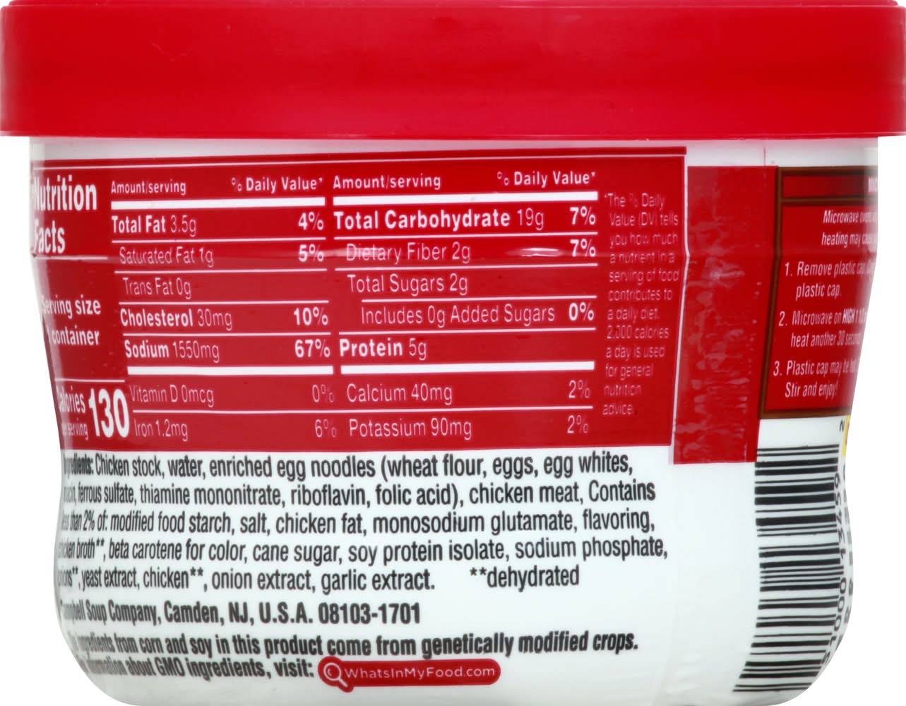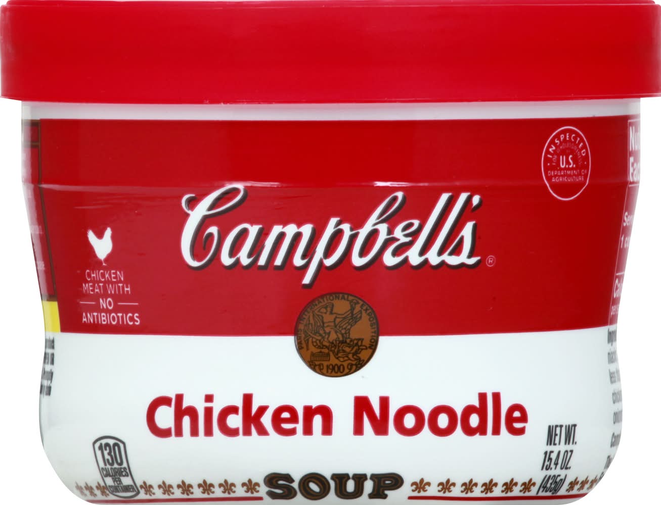 Take this twist on classic flavors you know and love on the road with Campbell's Chicken Noodle Soup. Every spoonful of this comforting chicken soup is crafted with delicious ingredients you grew up on. The savory taste of seasoned chicken broth, egg noodles and tender chicken meat with no antibiotics makes this soup a delicious and nostalgic choice anytime, anywhere. This chicken soup is made without high fructose corn syrup for a snack you can feel good about. Just pop off the cap, peel back the cover, replace the cap and microwave for one minute and 30 seconds. Let this easy to microwave soup sit for one minute and enjoy! Take this instant soup on the go for an easy, portable snack, appetizer or side dish for a delicious lunch. The microwavable soup bowl makes it easy to enjoy, no dishes required. Embark on your next adventure with Campbell's soups along for the ride. M'm M'm Good! • Brand: Campbell's • Campbell Soup Company, Camden,NJ,USA • Packaging: Reusable