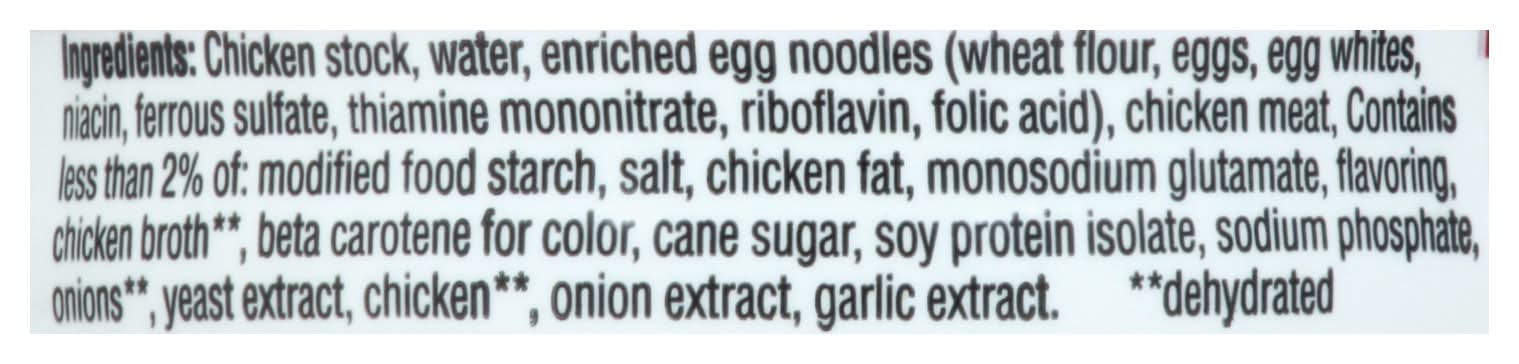 Ingredients: Chicken Stock, Water, Enriched Egg Noodles (Wheat Flour Eggs Egg Whites Niacin Ferrous Sulfate Thiamine Mononitrate Riboflavin Folic Acid), Chicken Meat, Contains Less than 2% of: Modified Food Starch, Salt, Chicken Fat, Monosodium Glutamate, Flavoring, Chicken Broth (Dehydrated), Beta Carotene for Color, Cane Sugar, Soy Protein Isolate, Sodium Phosphate, Onions (Dehydrated), Yeast Extract, Chicken (Dehydrated), Onion Extract, Garlic Extract Contains: Wheat, Eggs, Soybeans