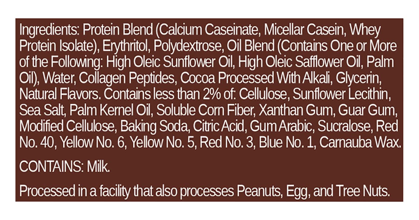 Ingredients: Protein Blend (Calcium Caseinate, Micellar Casein, Whey Protein Isolate), Water, Erythritol, Polydextrose, High Oleic Sunflower Oil, Collagen Peptides, Glycerin, Cocoa Processed with Alkali, Natural Flavors. Contains Less than 2% of: Cellulose, Sunflower Lecithin, Sea Salt, Palm Oil, Palm Kernel Oil, Soluble Corn Fiber, Xanthan Gum, Modified Cellulose, Baking Soda, Citric Acid, Gum Arabic, Sucralose, Red No. 40, Yellow No. 6, Yellow No. 5, Red No. 3, Blue No. 1, Carnauba Wax Contains: Milk, Peanuts, Tree Nuts