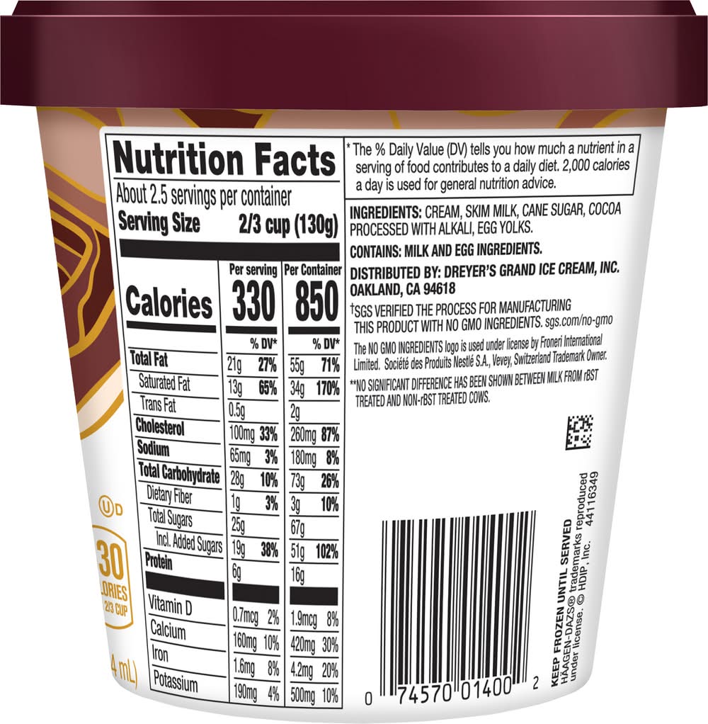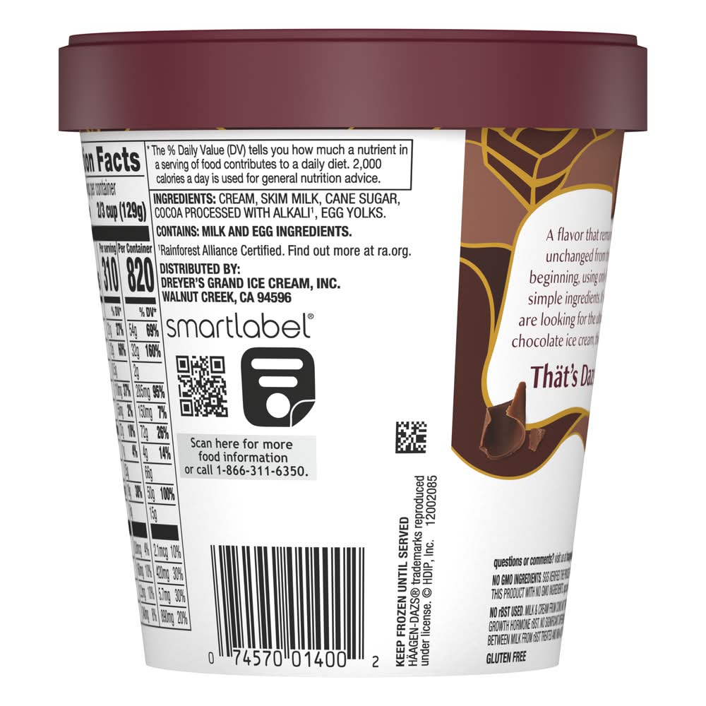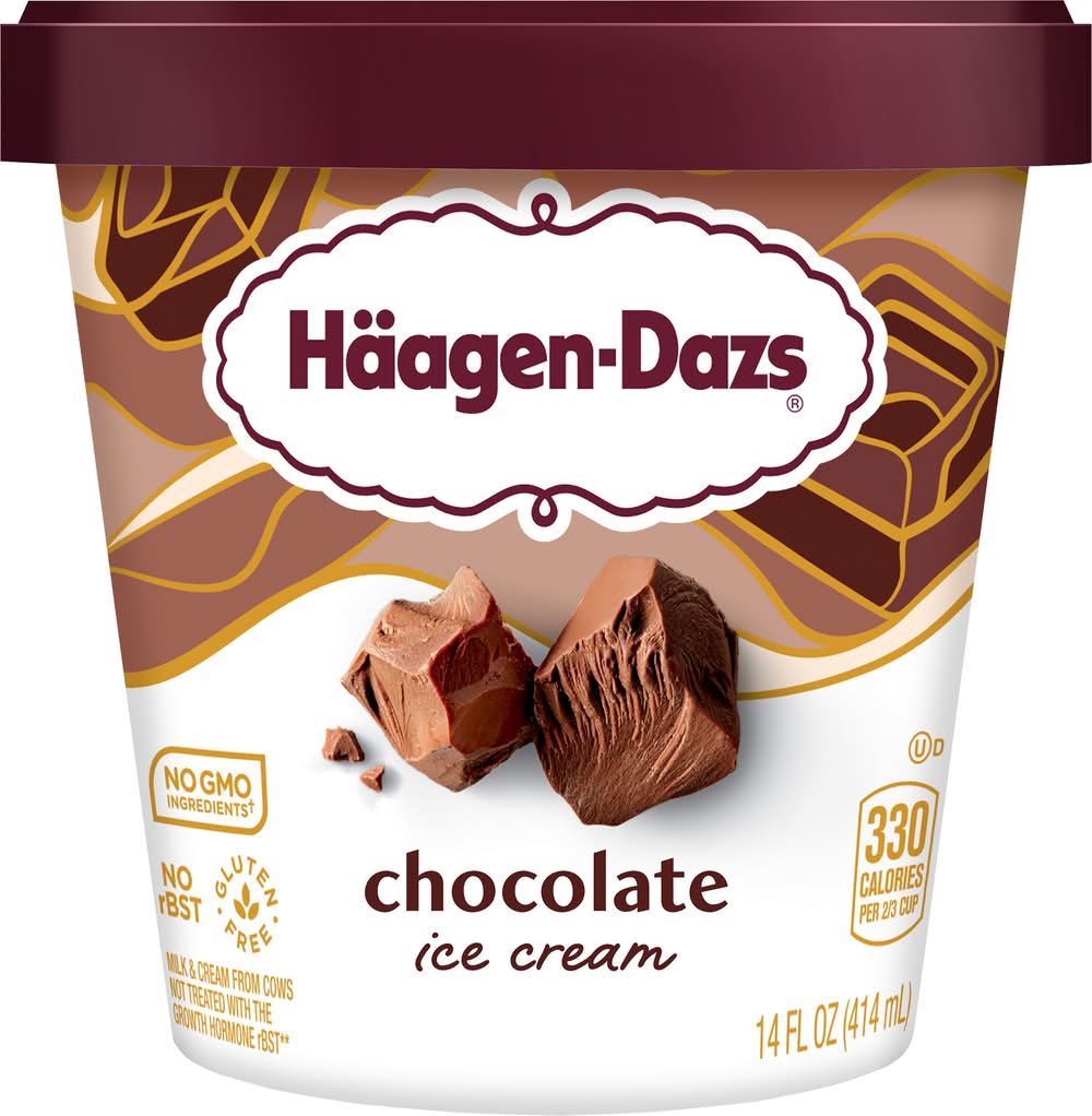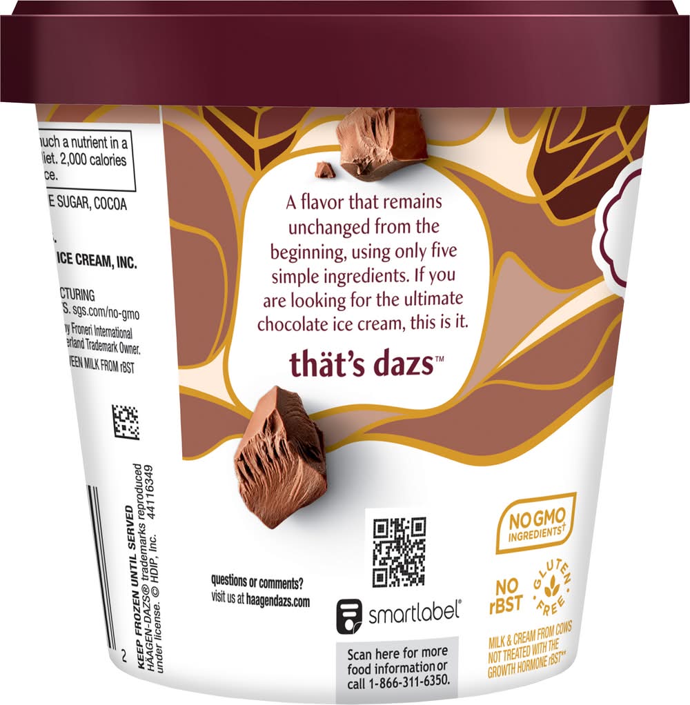 Rich, creamy, and totally indulgent. Made from the finest cocoa and pure, sweet cream, this chocolate ice cream is the ultimate experience. • Brand: Häagen-dazs • Flavor: Chocolate • gluten-free, kosher, GMO-free