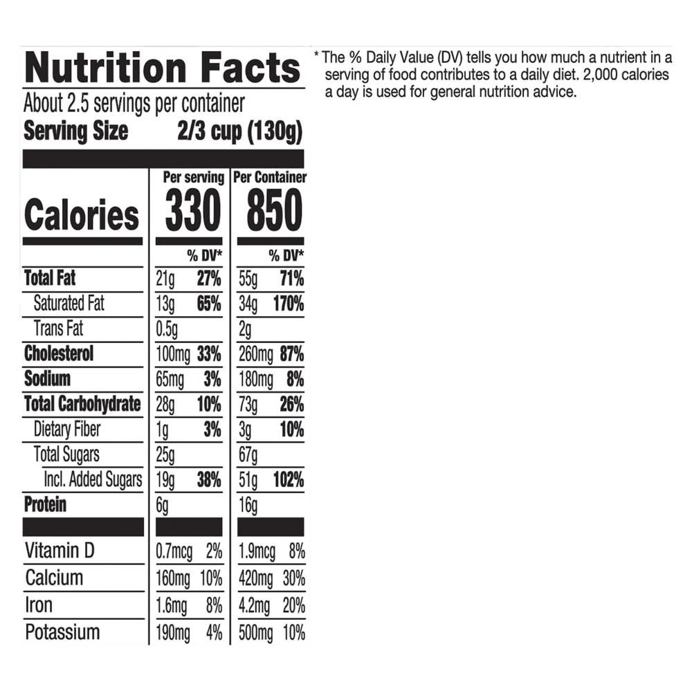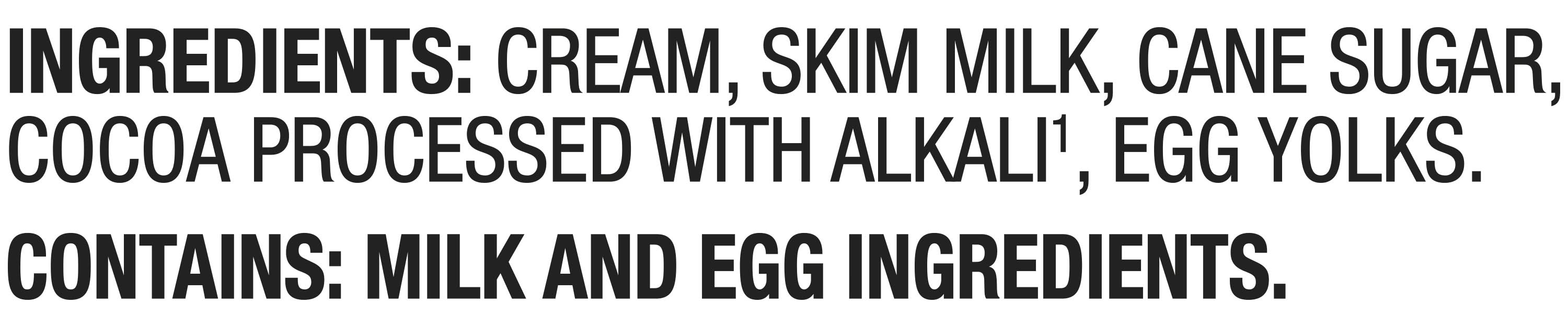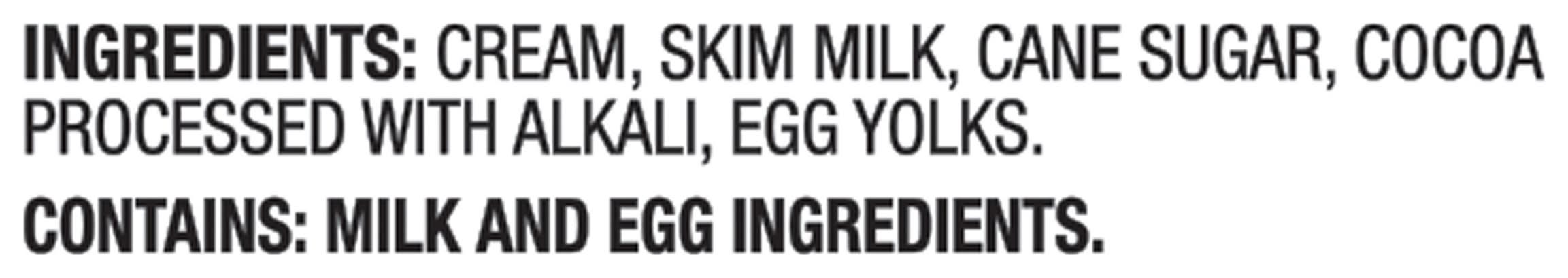 Ingredients: Cream, Skim Milk, Cane Sugar, Cocoa Processed with Alkali, Egg Yolks. Contains: Milk, Eggs