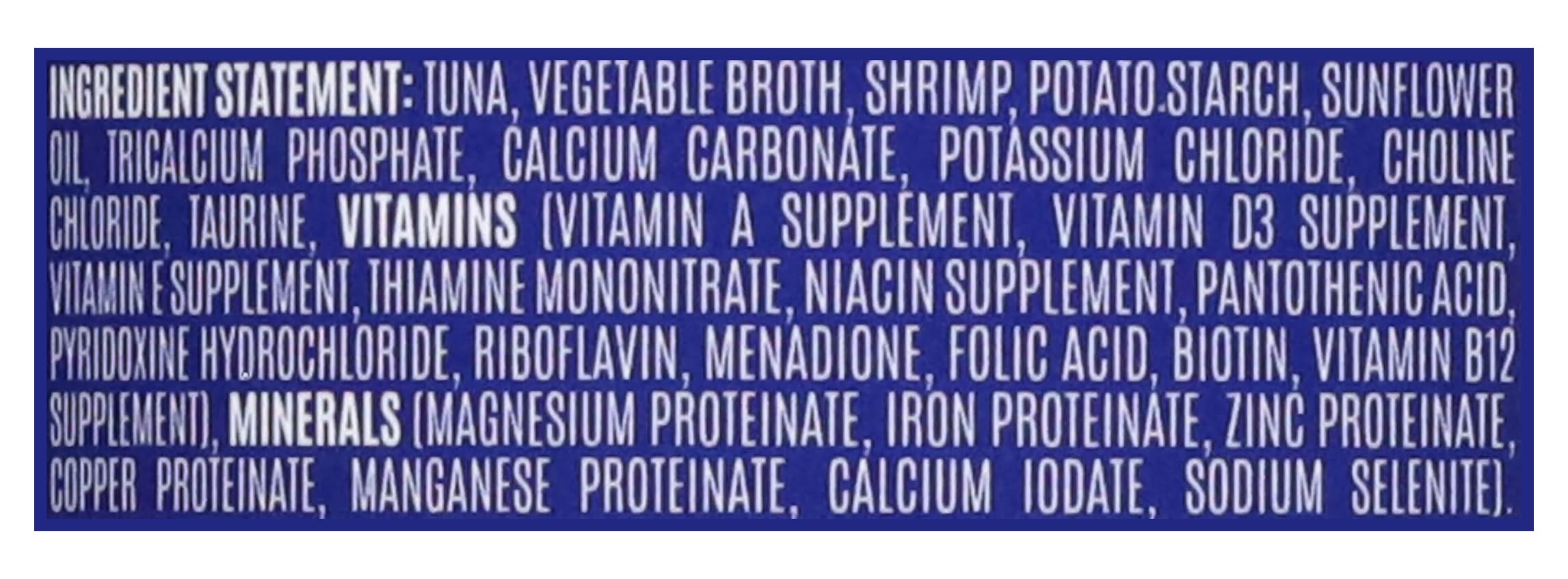 Ingredients: Tuna, Vegetable Broth, Shrimp, Potato Starch, Sunflower Oil, Tricalcium Phosphate, Calcium Carbonate, Potassium Chloride, Choline Chloride, Taurine, Vitamins (Vitamin A Supplement, Vitamin D3 Supplement, Vitamin E Supplement, Thiamine Mononitrate, Niacin Supplement, Pantothenic Acid, Pyridoxine Hydrochloride, Riboflavin, Menadione, Folic Acid, Biotin, Vitamin B12 Supplement), Minerals (Magnesium Proteinate, Iron Proteinate, Zinc Proteinate, Copper Proteinate, Manganese Proteinate, Calcium Iodate, Sodium Selenite) Contains: Fish, Tuna, Crustacean Shellfish, Shrimp