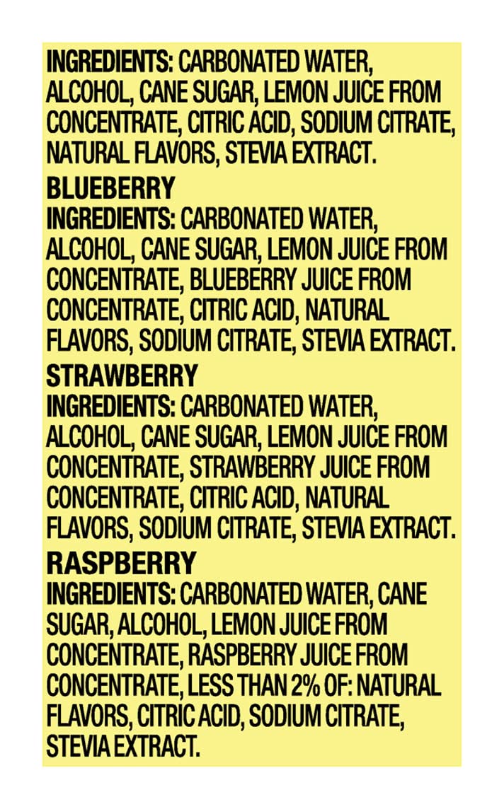Ingredients: Signature Lemonade: Carbonated Water, Alcohol, Cane Sugar, Lemon Juice from Concentrate, Citric Acid, Sodium Citrate, Natural Flavors, Stevia Extract. Blueberry Lemonade: Carbonated Water, Alcohol, Cane Sugar, Lemon Juice from Concentrate, Blueberry Juice from Concentrate, Citric Acid, Natural Flavors, Sodium Citrate, Stevia Extract. Strawberry Lemonade: Carbonated Water, Alcohol, Cane Sugar, Lemon Juice from Concentrate, Strawberry Juice from Concentrate, Citric Acid, Natural Flavors, Sodium Citrate, Stevia Extract. Raspberry Lemonade: Carbonate Water, Cane Sugar, Alcohol, Lemon Juice from Concentrate, Raspberry Juice from Concentrate, Less than 2% of: Natural Flavors, Citric Acid, Sodium Citrate, Stevia Extract.