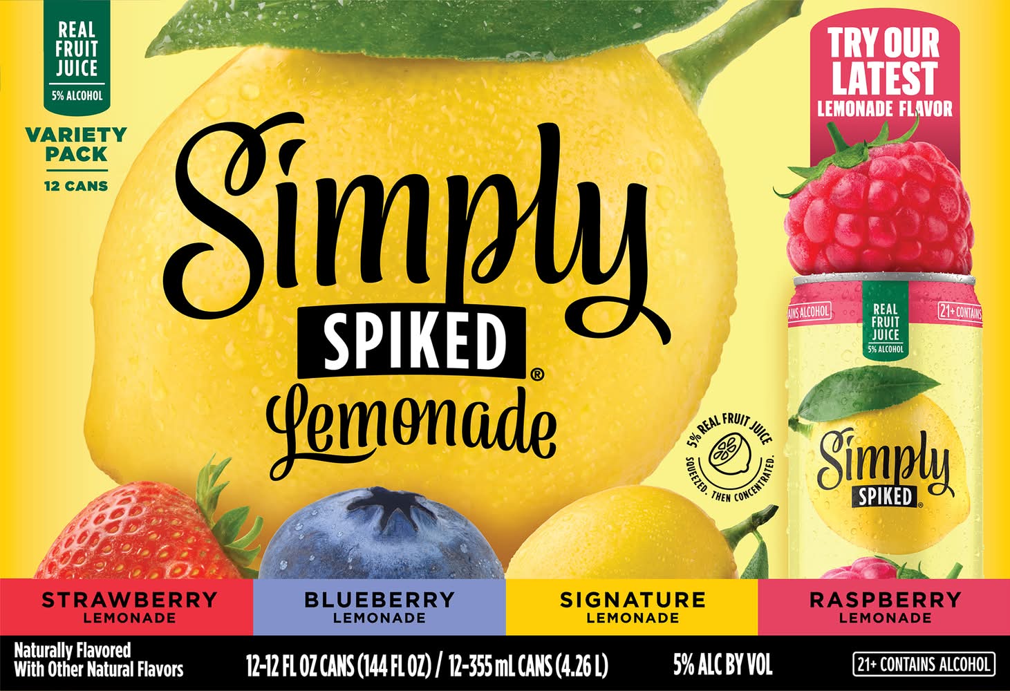 From the Juice Experts of the #1 Lemonade Brand in the Country, Simply® Spiked Lemonade is a spiked juice beverage made with REAL fruit juice. At 5% ABV, Simply Spiked Lemonade brings ultra-refreshing & exciting lemonade flavors: Signature Lemonade, Strawberry Lemonade, Blueberry Lemonade & Watermelon Lemonade. • Brand: Simply spiked • Flavor: Assorted • Pack size: 12 • gluten-free, kosher • Alcohol by volume: 5%