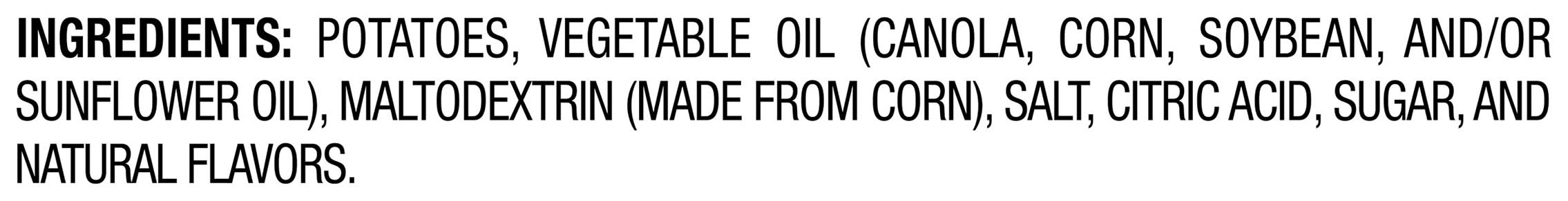 Ingredients: Potatoes, Vegetable Oil (Canola, Corn, Soybean, and/or Sunflower Oil), Maltodextrin (Made from Corn), Salt, Citric Acid, Sugar, and Natural Flavors Contains: Soybeans